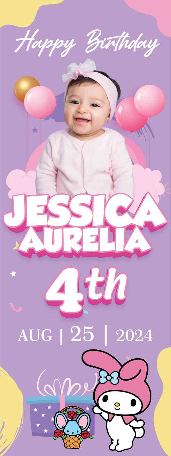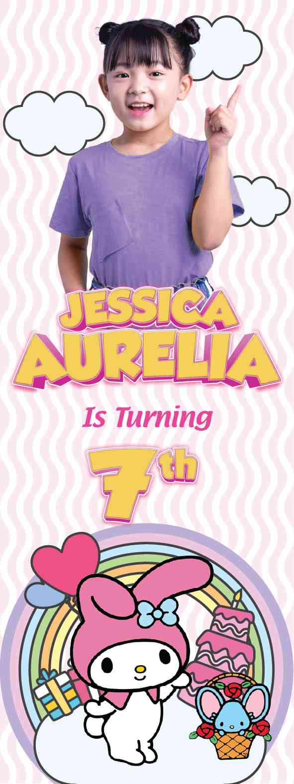 Selamat datang di Pesta Ulang Tahun yang penuh keceriaan, dikelilingi dengan pesona My Melody! Standing banner ini adalah sentuhan manis yang menyambut Anda dengan gambar My Melody yang lucu dan menggemaskan. Latar belakangnya dipenuhi dengan warna-warna pastel yang lembut, menciptakan atmosfer yang hangat dan mengundang. My Melody tersenyum ceria dalam berbagai pose yang menggemaskan, sementara aksen bunga-bunga kecil dan detail berlian memberikan sentuhan elegan dan manis yang sempurna. Standing banner ini bukan hanya dekorasi, tetapi juga pengingat akan kebahagiaan dan keceriaan dalam momen ulang tahun Anda yang istimewa. Mari merayakan hari istimewa ini dengan nuansa kelembutan dan kegembiraan dari My Melody!