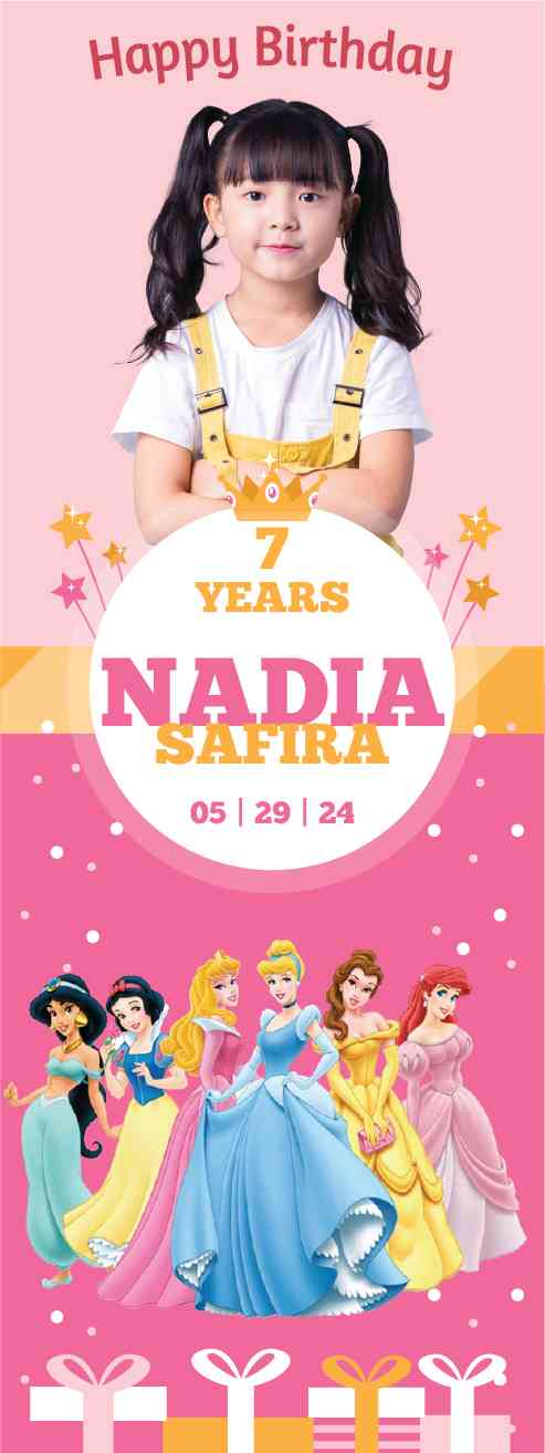 Banner ulang tahun dengan tema princess adalah sentuhan magis yang memperindah ruang perayaan. Dengan panjangnya yang menghiasi dinding, banner ini me...