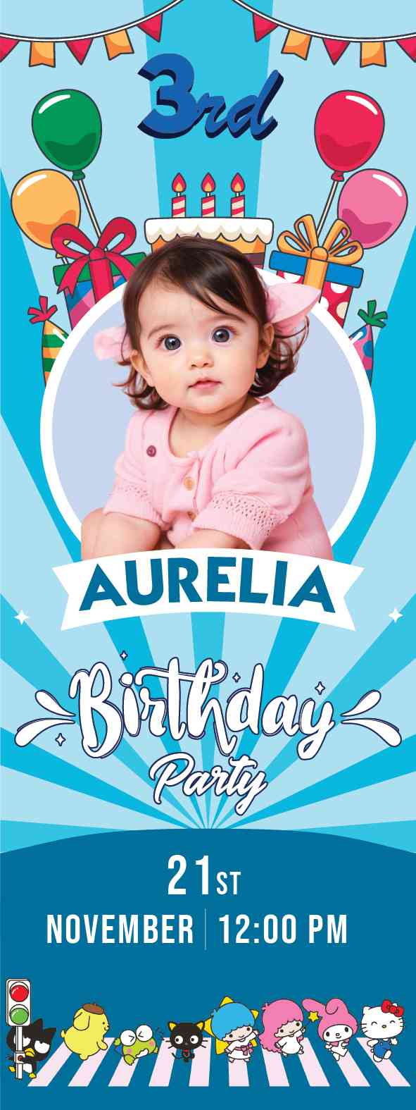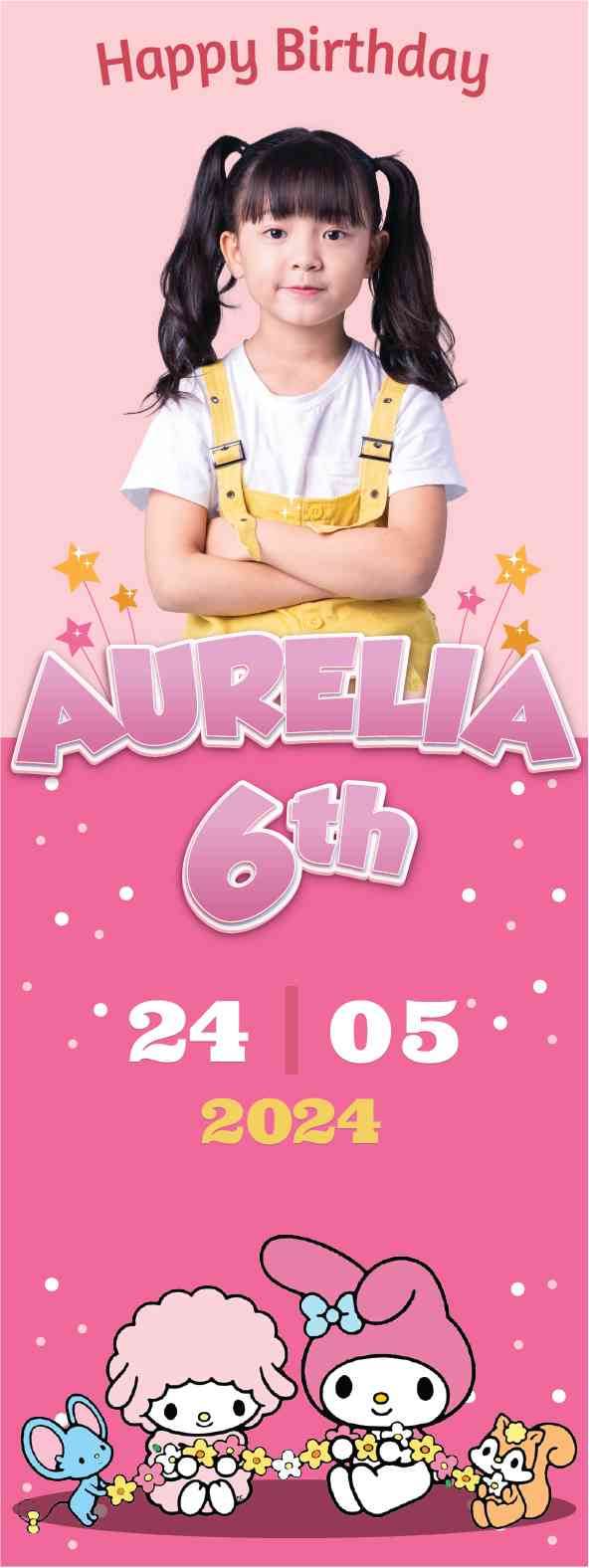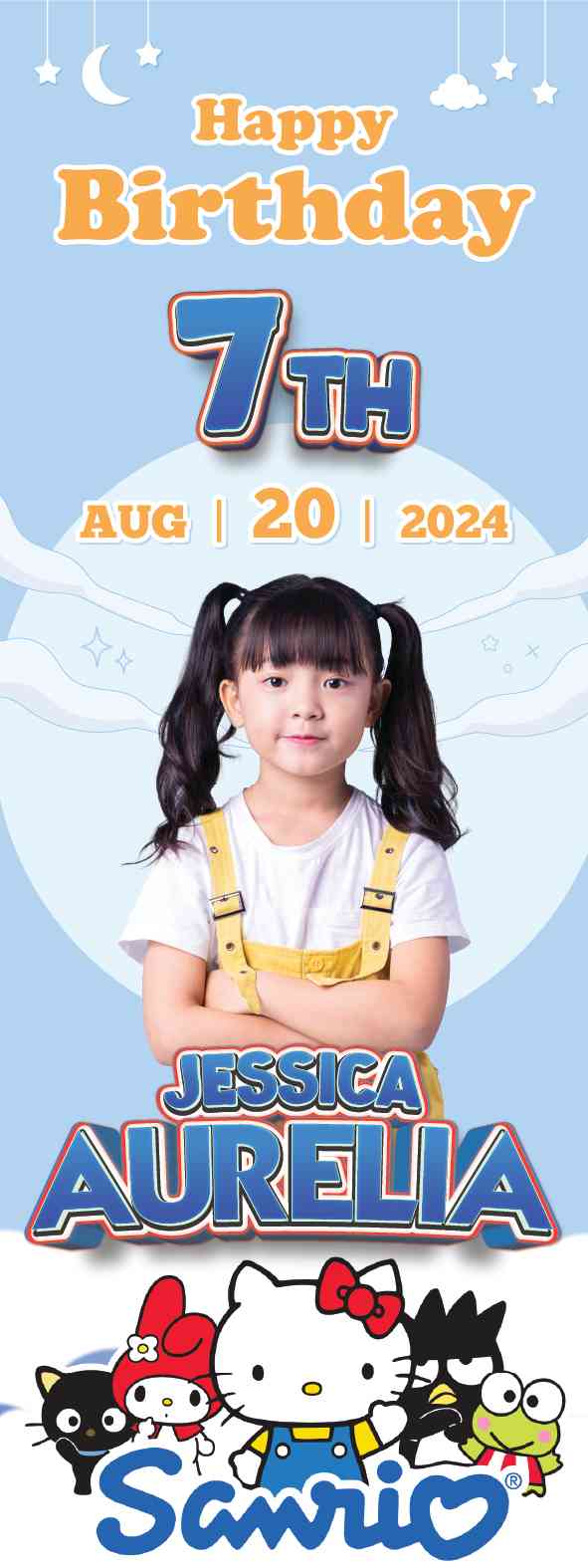 Standing banner ini hadir untuk memeriahkan hari istimewa [Nama Anak]. Dengan karakter-karakter ikonik seperti Hello Kitty, My Melody, dan teman-temannya, kita merayakan kebahagiaan dan keceriaan dalam nuansa yang penuh warna-warni!