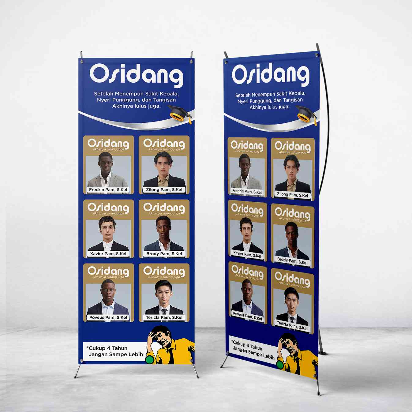 Standing banner ini mengusung konsep kreatif dengan memplesetkan merek obat "Oskadon" menjadi "Osidang," sebagai simbol perjuangan mahasiswa menghadap...
