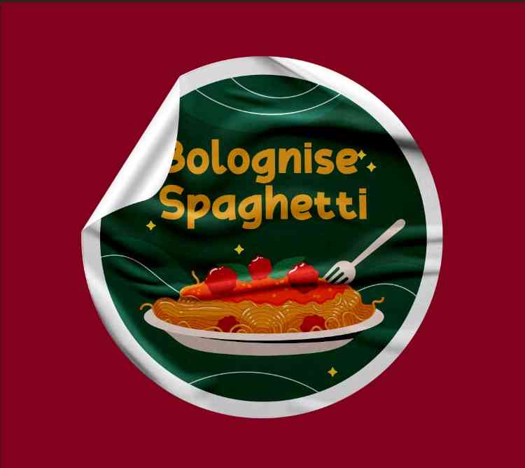 Stiker ini menampilkan ilustrasi spaghetti bolognese yang menggoda, dengan saus merah menyala, meatball berlimpah, dan garnish daun basil segar. Desai...
