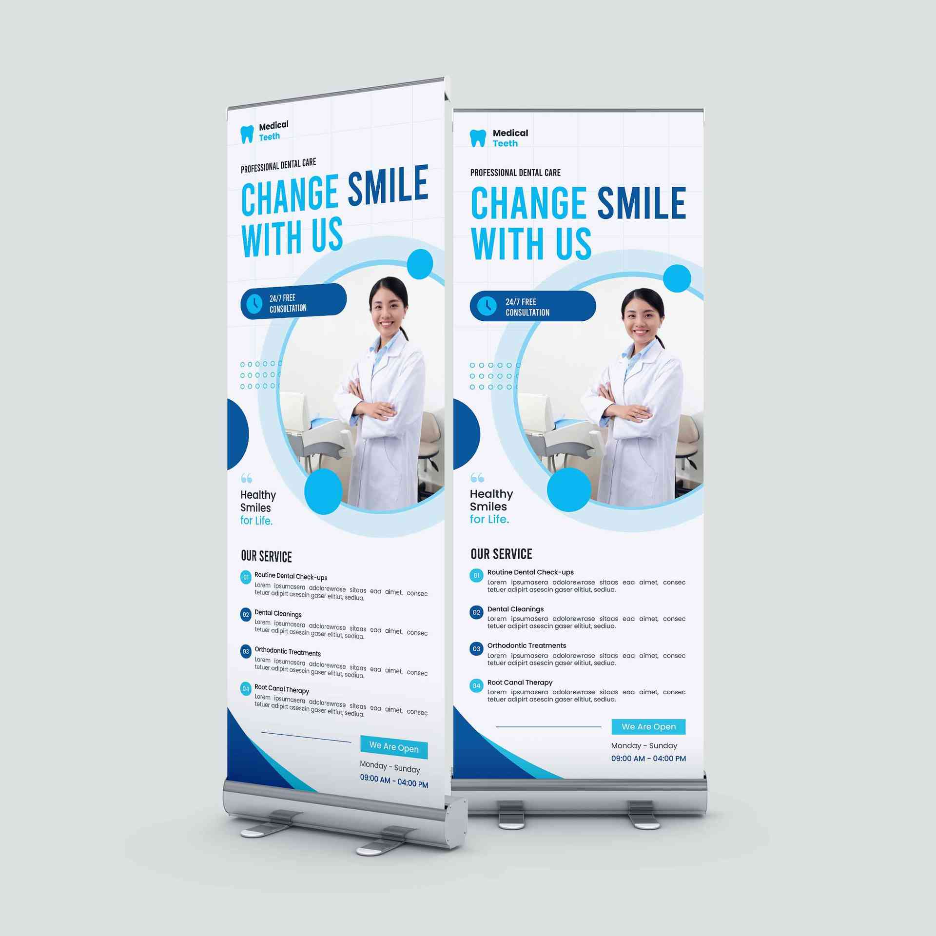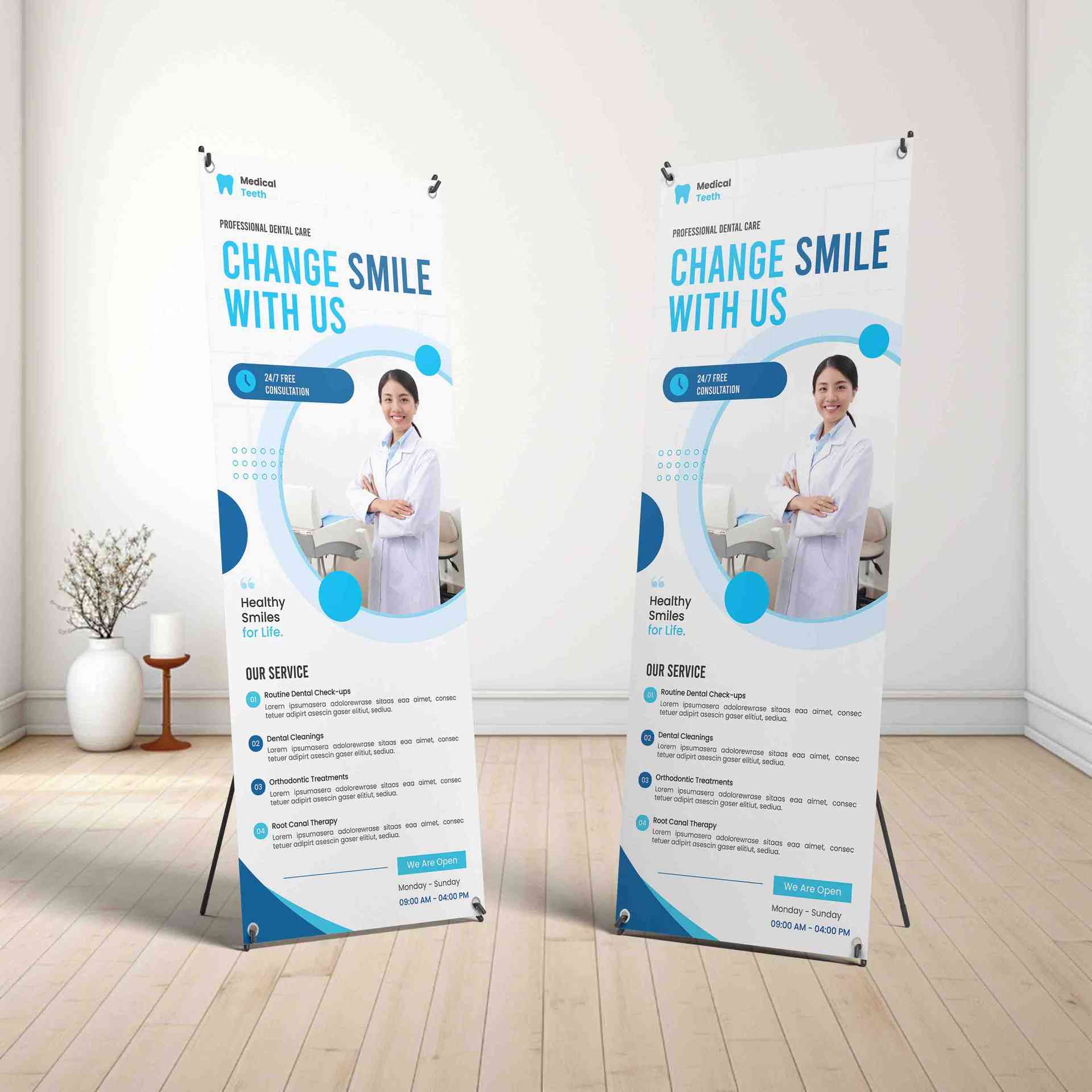 X-Banner Dental Clinic 🦷✨ X-Banner ini dirancang khusus untuk kebutuhan promosi klinik gigi profesional, dengan desain modern berwarna biru putih yan...