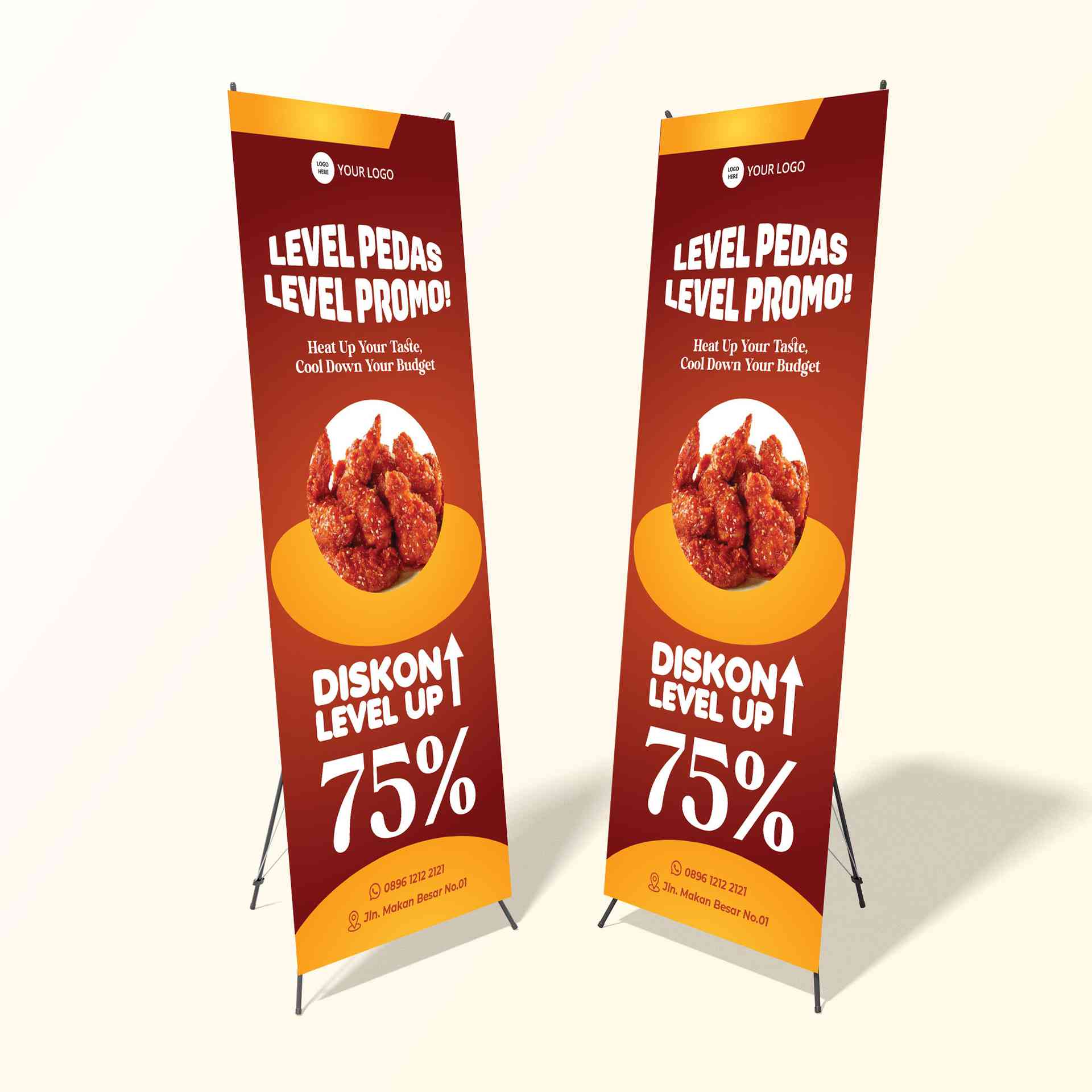 Banner ini adalah standing banner vertikal yang dirancang untuk promosi "Diskon Natal". Desain utamanya memiliki latar belakang berwarna hitam pekat y...