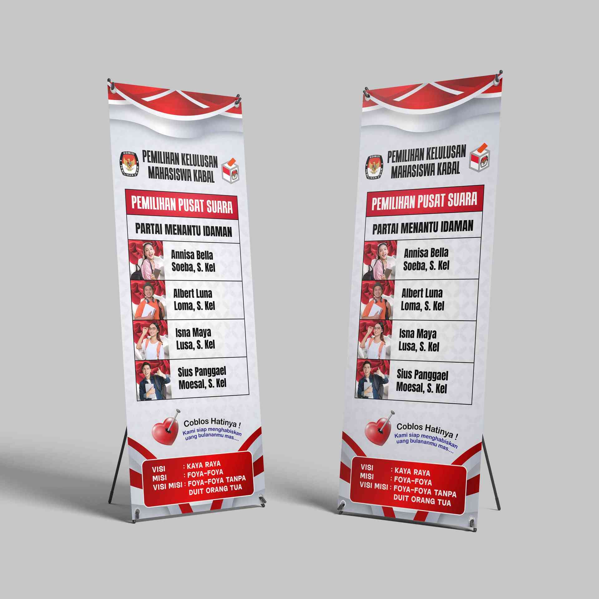 Semua konten tulisan dan gambar dalam desain ini bisa diubah sesuai kebutuhan, baik untuk keperluan parodi kampus, perayaan kelulusan, atau acara pemilihan internal organisasi. Anda dapat mengganti nama, gelar, slogan, bahkan menyesuaikan warna dan foto sesuai tema acara yang diinginkan. Desain ini sangat cocok untuk membuat suasana event menjadi lebih meriah, interaktif, dan meninggalkan kesan mendalam bagi peserta maupun penonton. X-banner ini bukan sekadar media informasi, tetapi juga bentuk kreativitas visual yang bisa menghibur sekaligus mempererat kebersamaan mahasiswa 🎓✨.