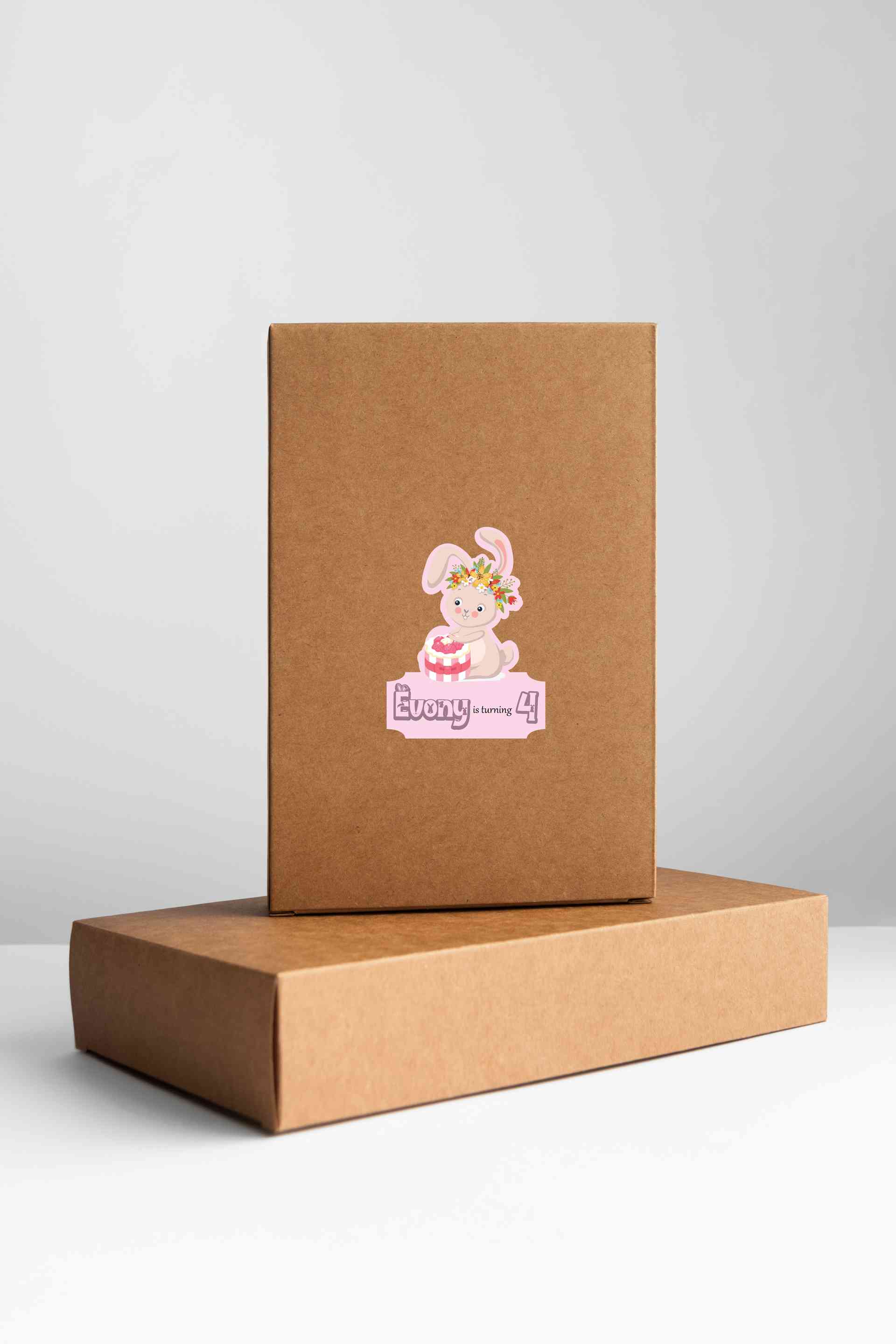 Di tengah stiker, terdapat ilustrasi gambar anak perempuan kartun yang tampak ceria dan penuh kegembiraan. Anak perempuan tersebut mengenakan gaun cantik dengan warna cerah yang kontras dengan latar belakang, menambah kesan ceria dan penuh warna. Di sampingnya, ada gambar kelinci kartun yang lucu, dengan ekspresi wajah yang menggemaskan. Kelinci ini tampak seolah ikut merayakan kebahagiaan si anak, menambah kesan penuh keceriaan dan kehangatan.