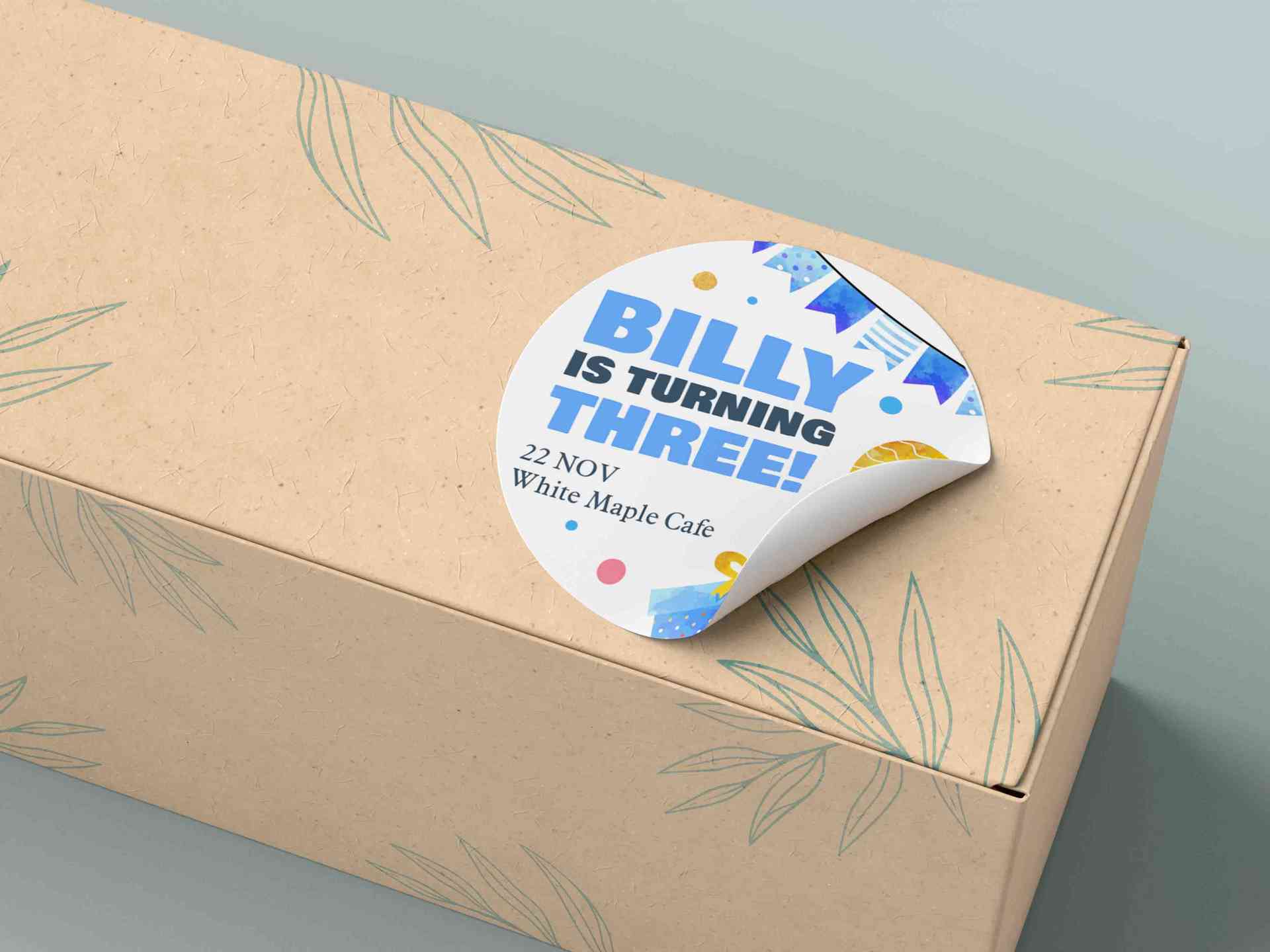 Stiker ulang tahun ini menampilkan ilustrasi kue tart berlapis yang didominasi warna pink, kuning, dan biru, serta dihiasi topping warna-warni dan dekorasi taburan. Desain visual utamanya memperlihatkan elemen kue yang tampak manis dan ceria, diiringi tipografi nama dan acara dengan aksen warna pink dan hitam tebal. Tema visual berfokus pada suasana pesta ulang tahun yang meriah dan ramah untuk anak-anak, cocok digunakan sebagai label, dekorasi, atau souvenir pada acara ulang tahun dengan target pasar keluarga atau penyelenggara pesta.