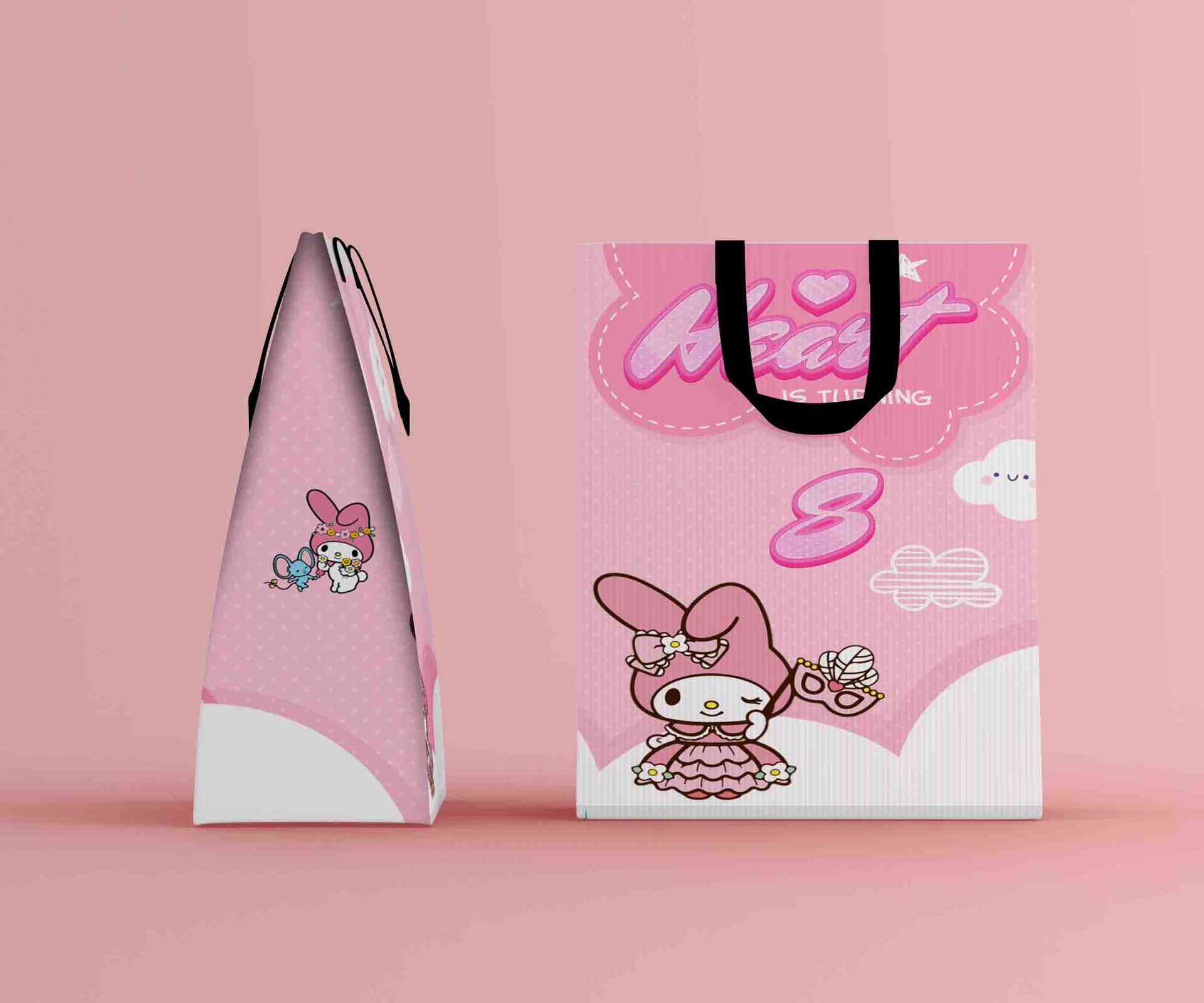 Paper bag ulang tahun dengan tema Melody Party tampil dalam bentuk kotak tegak, didominasi warna pink pastel dengan latar polkadot dan hiasan awan put...