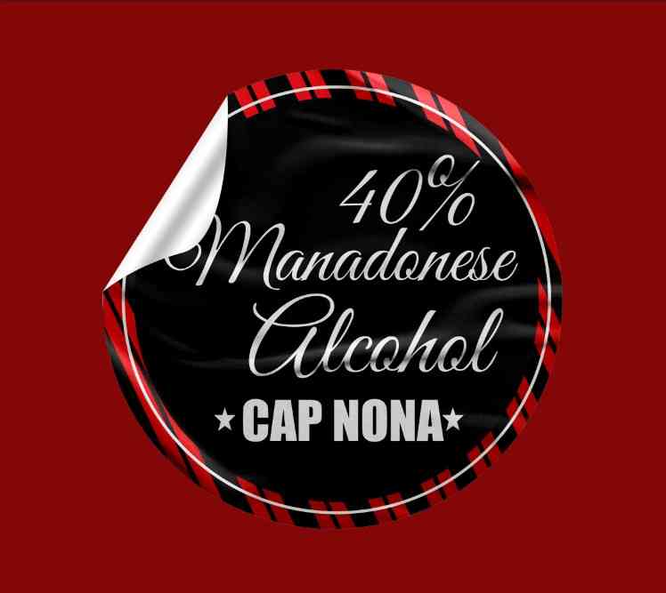 Stiker ini memiliki desain yang bold dan profesional, dengan latar belakang hitam yang memberi kesan elegan dan tegas. Teks “40% Manadonese Alcohol” d...