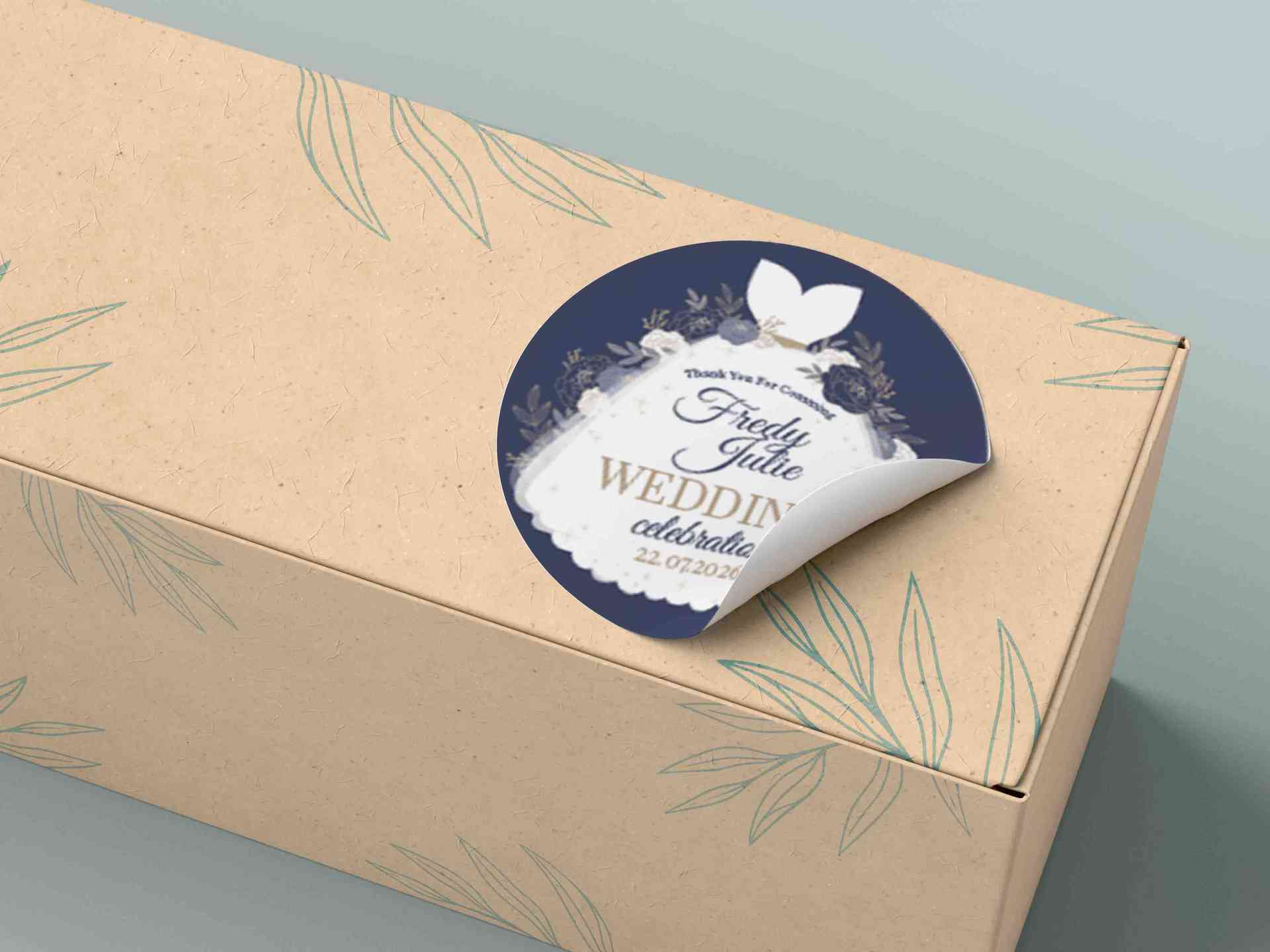 Desain stiker bulat ini menampilkan siluet gaun pengantin putih sebagai elemen utama yang elegan dan memikat, dikelilingi oleh bunga-bunga bergaya vin...