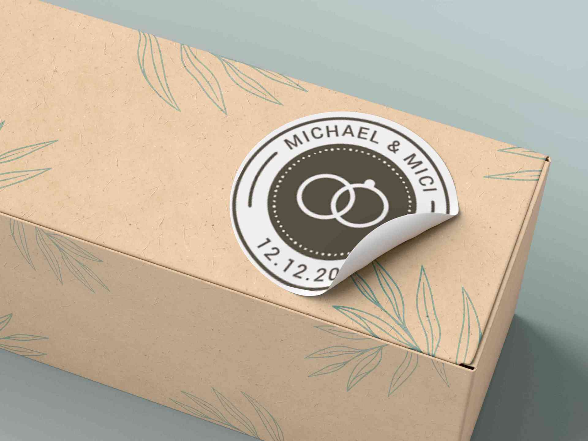 Desain stiker ini mengusung gaya minimalis modern dengan bentuk bulat dan palet warna coklat tua yang elegan. Di bagian tengah terdapat ikon dua cinci...