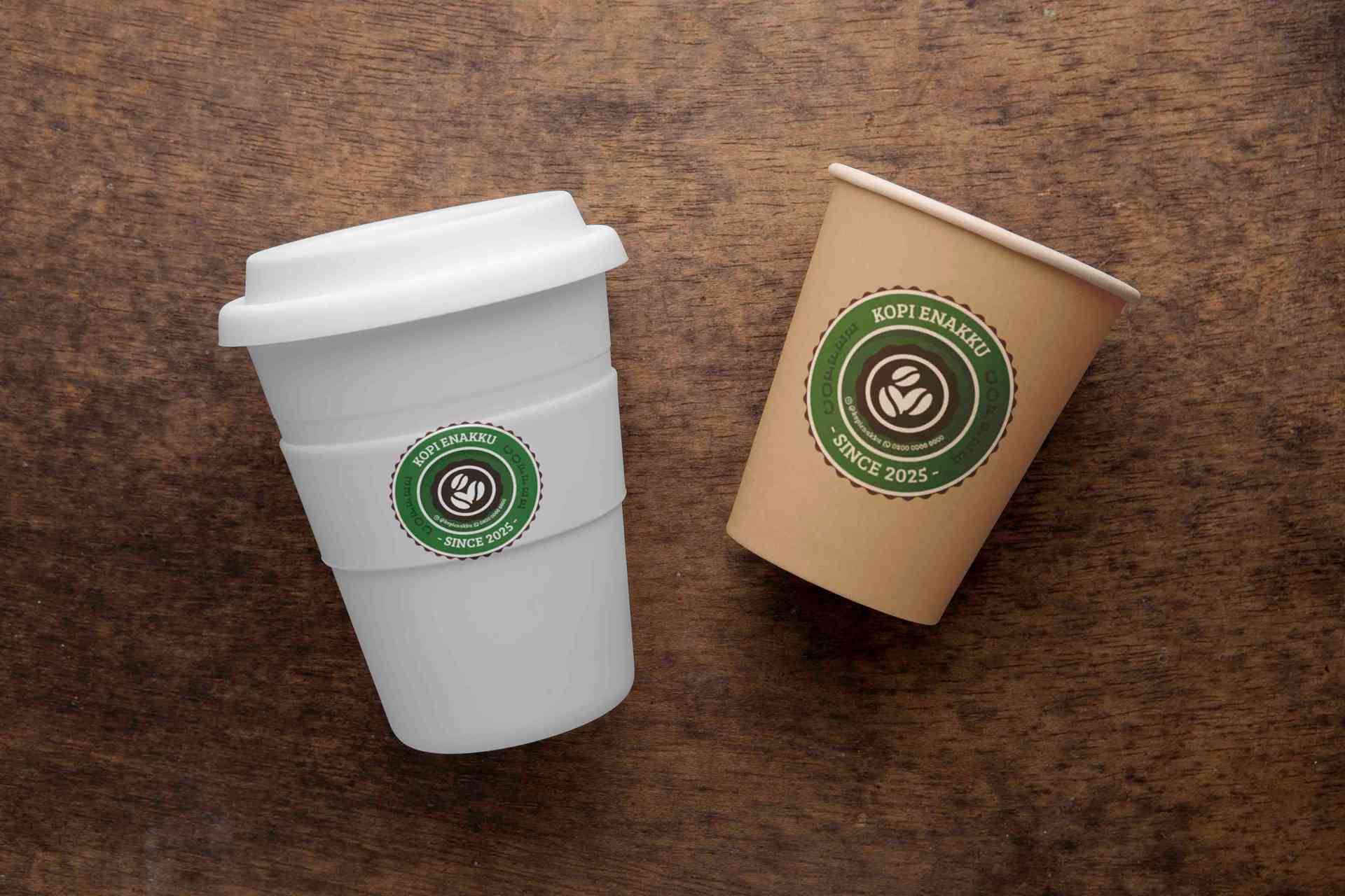 Stiker bundar ini dirancang untuk memperkuat identitas brand kopi Kopiku Indonesia dengan tampilan sederhana namun kuat. Berlatarkan coklat tua yang menggambarkan warna kopi, bagian tengah menampilkan ilustrasi gelas kopi takeaway, disertai tulisan “KOPIKU INDONESIA”, “ESTD 2025”, dan slogan “ORIGINAL TASTE” yang mengelilinginya dalam susunan melingkar. Warna-warna hangat dan earthy membuatnya cocok digunakan pada berbagai jenis cup, baik putih maupun kraft paper, seperti terlihat pada mockup. Stiker ini sangat ideal untuk branding kedai kopi, bisnis minuman take-away, maupun produk kopi lokal dalam kemasan.
