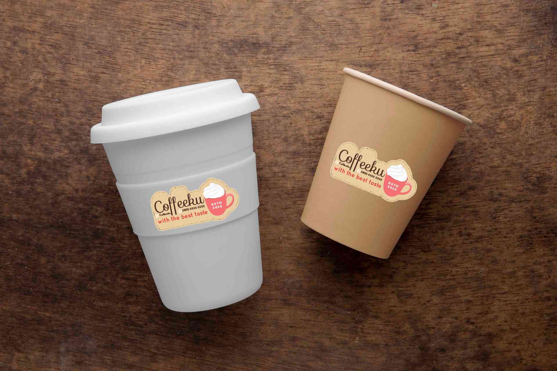Stiker ini mengusung gaya retro modern dengan ilustrasi tangan memegang kopi yang dikelilingi ornamen daun padi dan warna-warna khas vintage seperti cokelat tanah, jingga bata, dan hijau tua. Teks “Kopiku Enak” dan “Always Coffee” membentuk lingkaran di bagian atas logo, sementara info kontak tercetak pada pita bergelombang di bagian bawah, menambah kesan klasik namun tetap informatif. Cocok diaplikasikan pada gelas kertas maupun gelas takeaway putih, desain ini memberi kesan kuat akan cita rasa otentik dan branding lokal yang berkarakter.