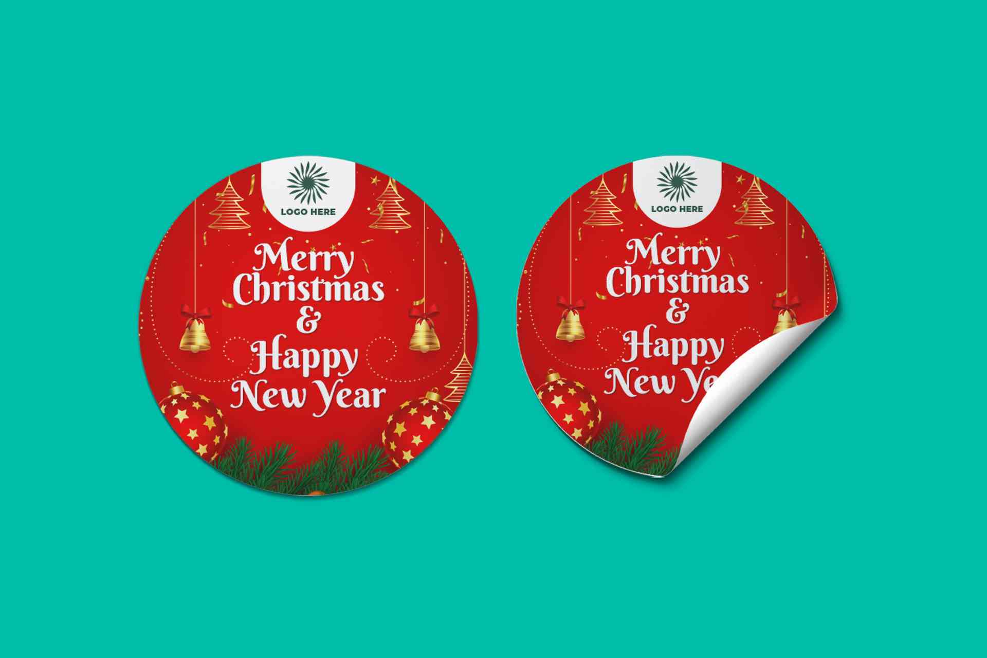 Stiker Natal berbentuk bulat dengan latar belakang merah cerah yang melambangkan semangat Natal. Dekorasi berwarna emas menghiasi pinggiran stiker, me...
