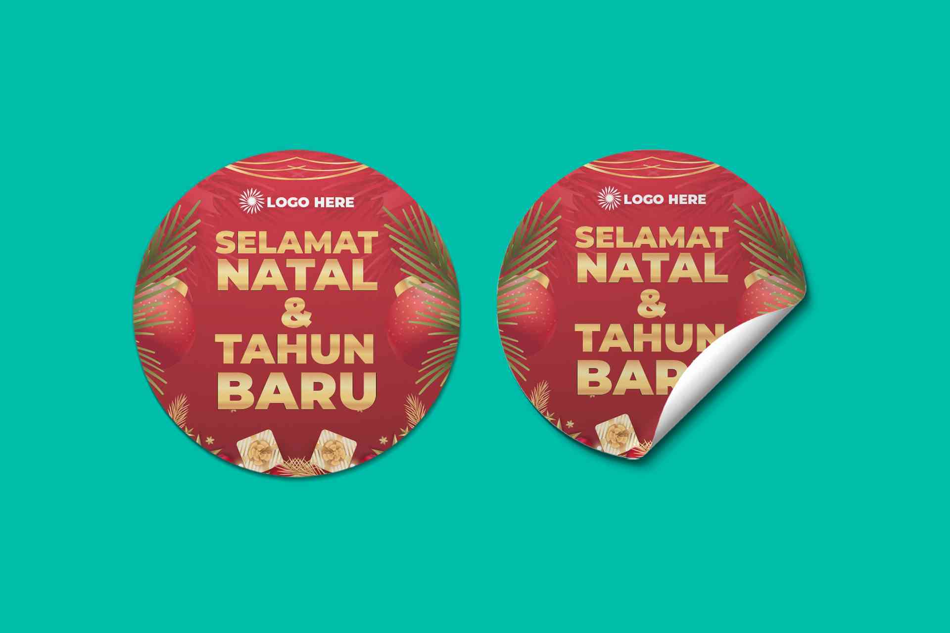 Stiker Natal berbentuk bulat dengan latar belakang merah yang memancarkan semangat dan kehangatan khas Natal. Dekorasi berwarna emas yang berkilauan m...