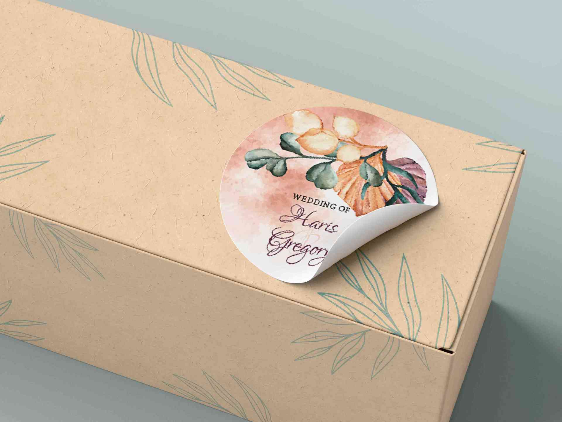 Desain ini sangat cocok untuk pernikahan bertema boho, tropikal, atau rustic modern, serta bisa diaplikasikan pada undangan, kemasan hampers, atau souvenir. Sentuhan seni lukis dan tipografi kaligrafi menjadikan stiker ini terlihat klasik namun tetap kekinian, sempurna untuk momen spesial yang berkesan.