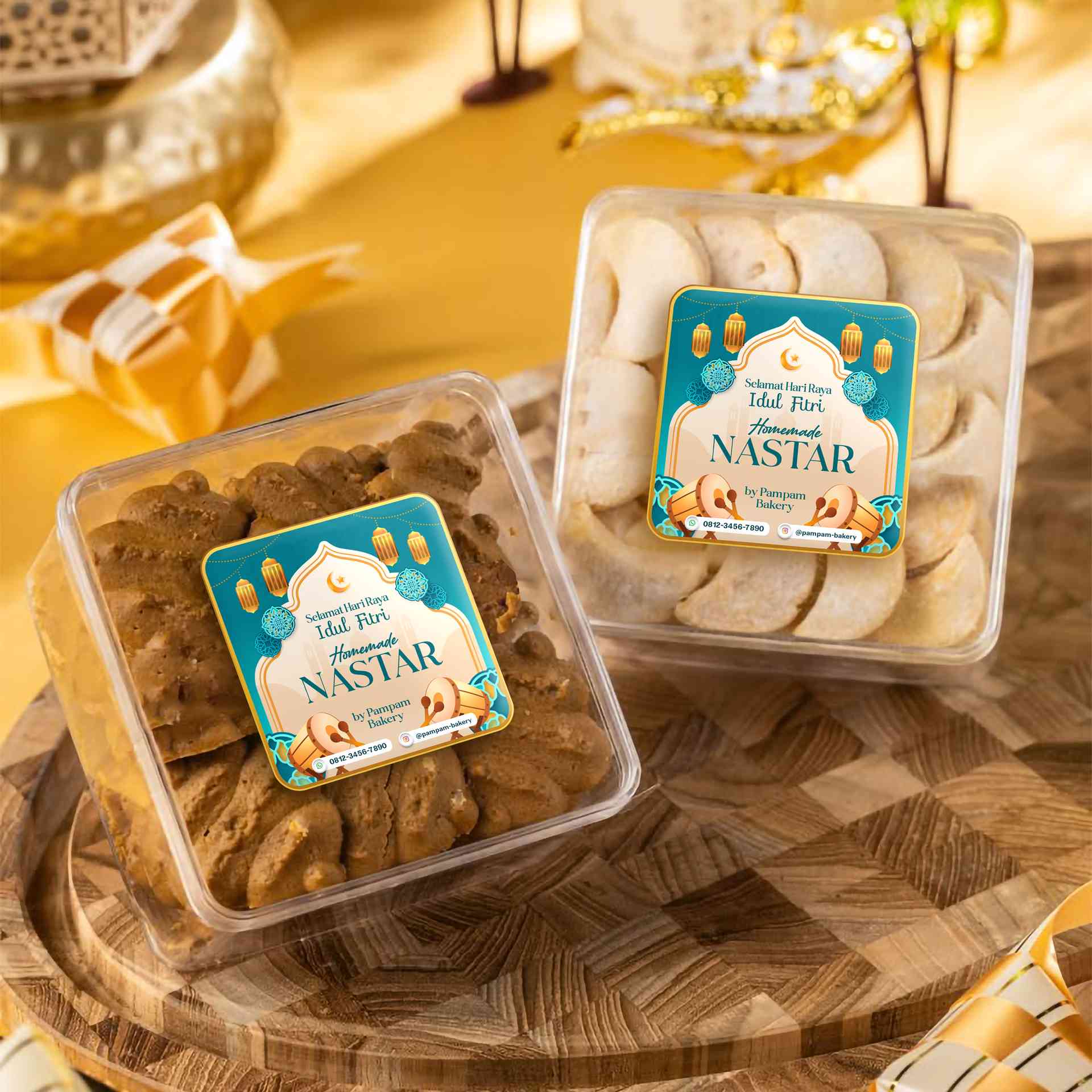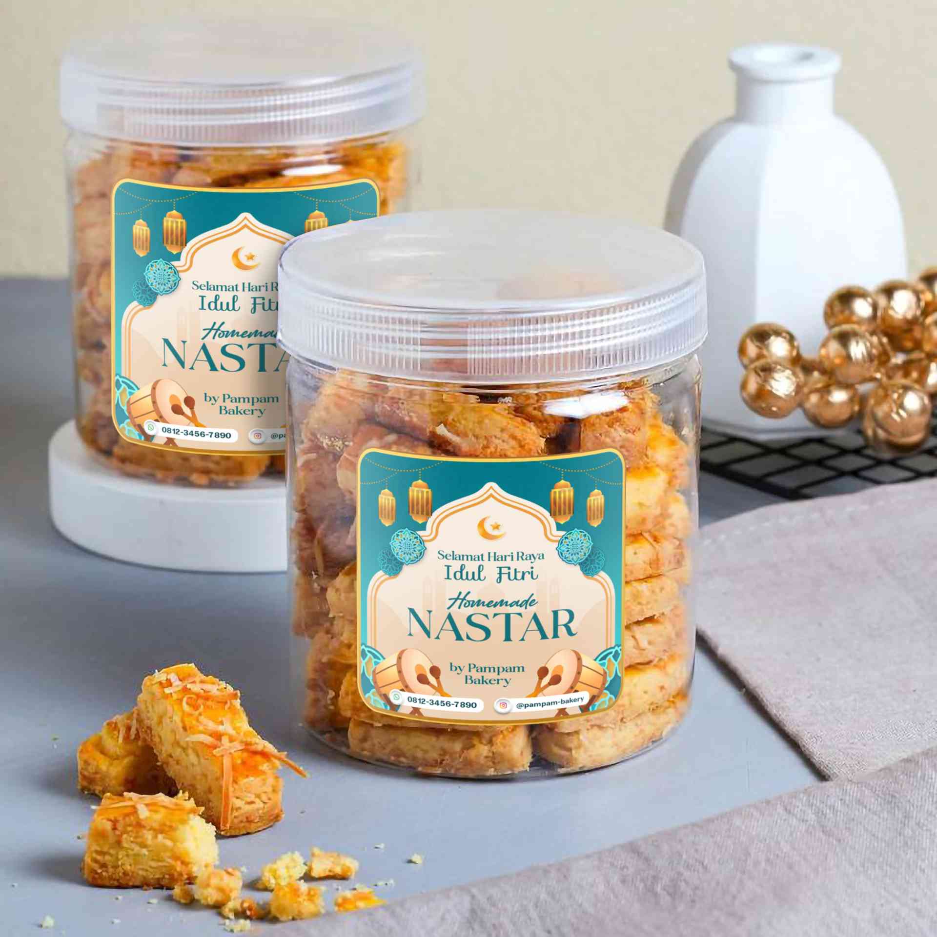 Stiker kemasan Idul Fitri pada toples nastar ini memiliki desain yang elegan dan minimalis dengan kombinasi warna putih, krem, dan sentuhan biru, menc...