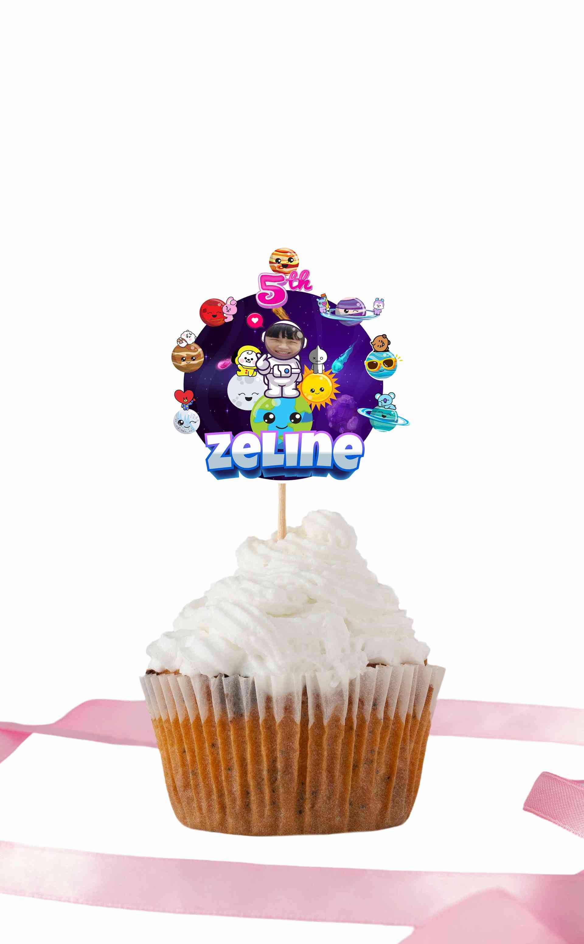 Desain topper ulang tahun ini mengusung tema luar angkasa yang ceria dan penuh warna. Pada bagian utama, terdapat seorang anak yang wajahnya dimasukkan ke dalam ilustrasi karakter astronot yang berdiri di atas planet dengan ekspresi gembira. Latar belakangnya menggambarkan suasana luar angkasa yang penuh dengan bintang, meteor berwarna-warni, serta planet-planet lucu dengan wajah ekspresif yang memberikan kesan menggemaskan. Di bagian atas, terdapat matahari dan bulan dengan wajah tersenyum, menambah kesan hangat dan ramah. Nama tampil dengan font besar, tebal, dan efek gradien biru yang memberikan kesan futuristik, sementara angka "5th" ditampilkan dalam warna pink cerah untuk menandai perayaan ulang tahun yang kelima. Desain ini sangat cocok untuk pesta ulang tahun anak dengan konsep luar angkasa, memberikan nuansa menyenangkan dan interaktif bagi si kecil serta para tamu yang hadir.
