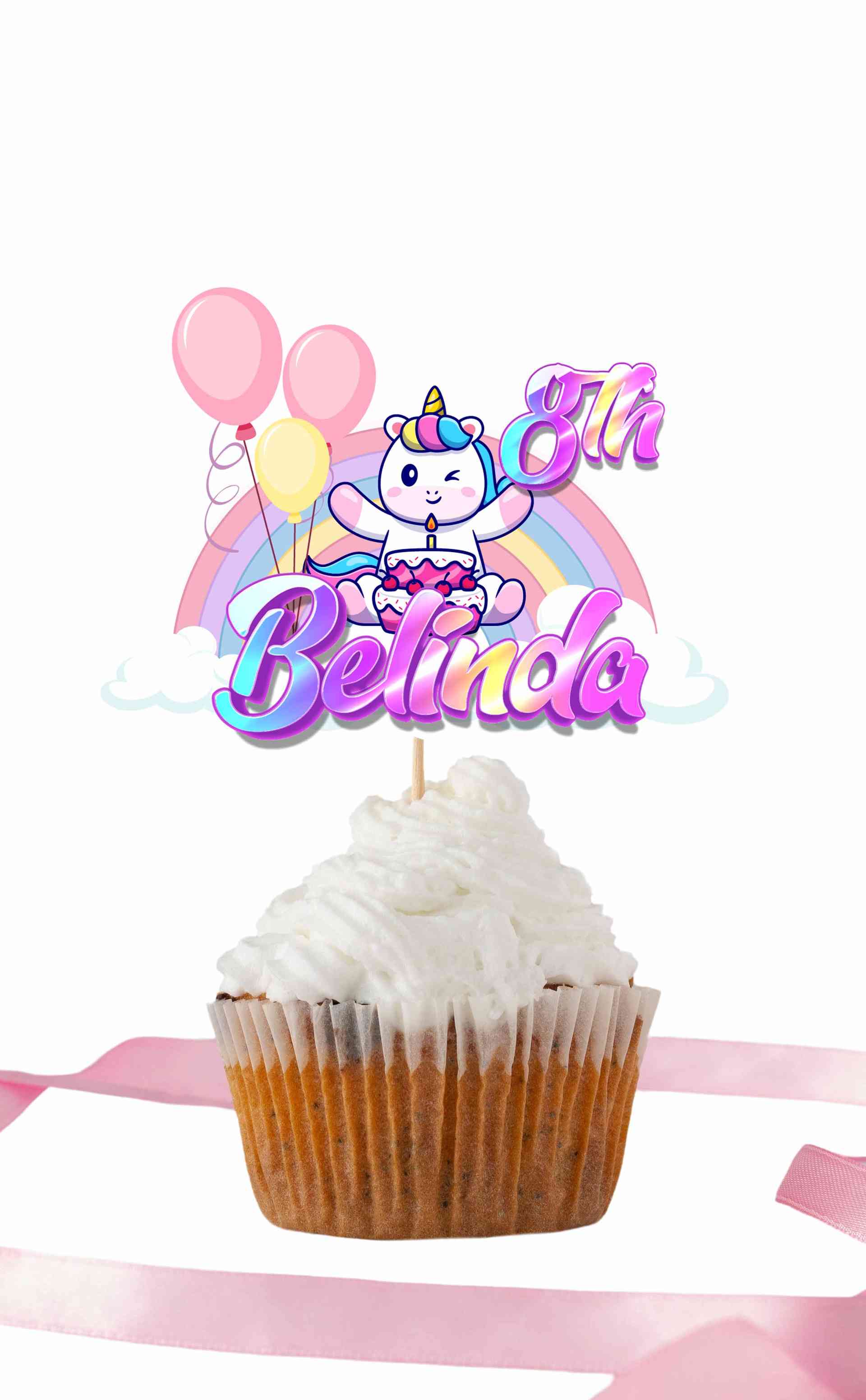 Topper cake ini memiliki desain bertema unicorn yang menggemaskan, dengan dominasi warna pastel cerah seperti pink, ungu, kuning, dan biru. Elemen uta...