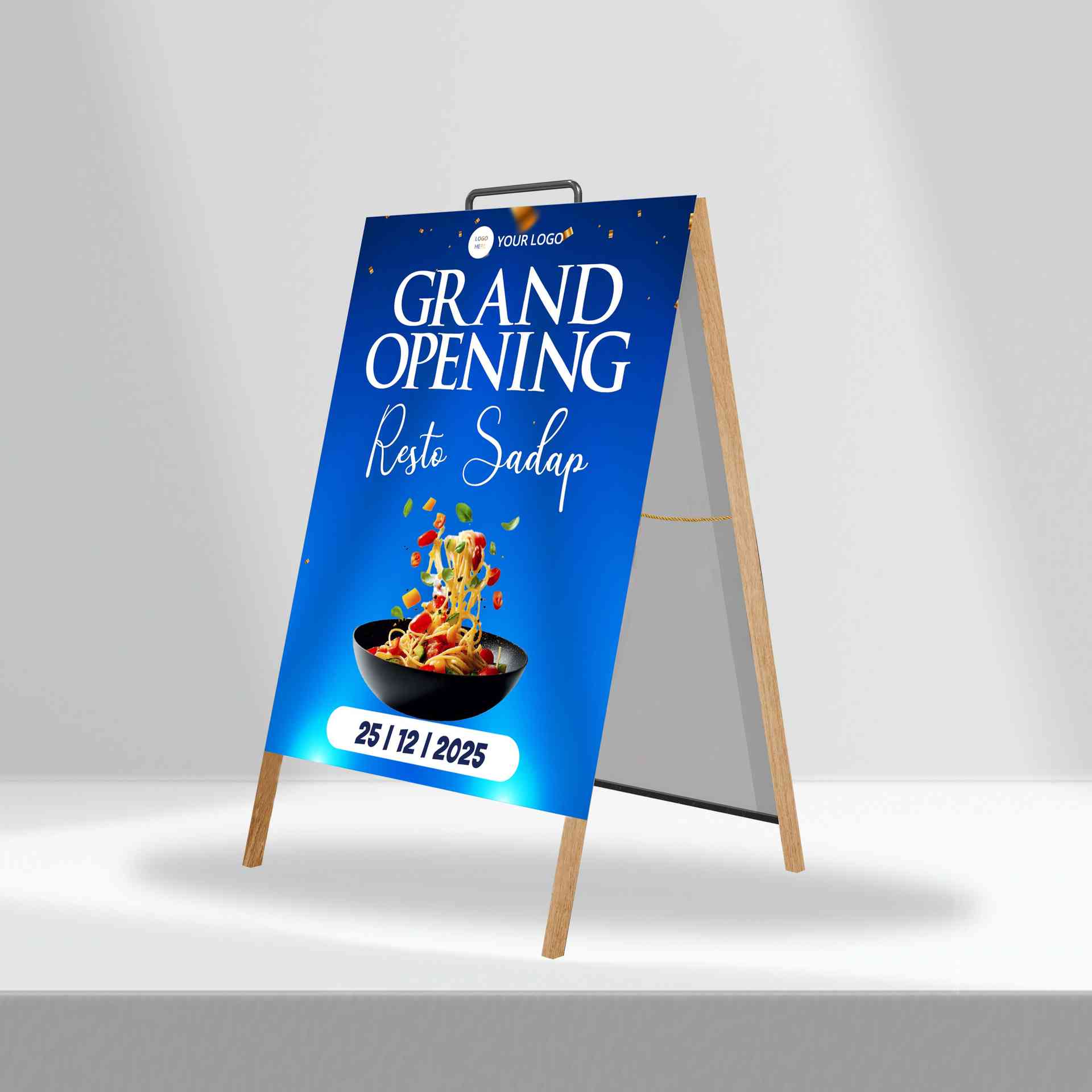 Triangle Stand Banner Kayu dengan desain tema pembukaan restoran ini berbentuk segitiga vertikal yang kokoh dengan material utama kayu, memajang banne...