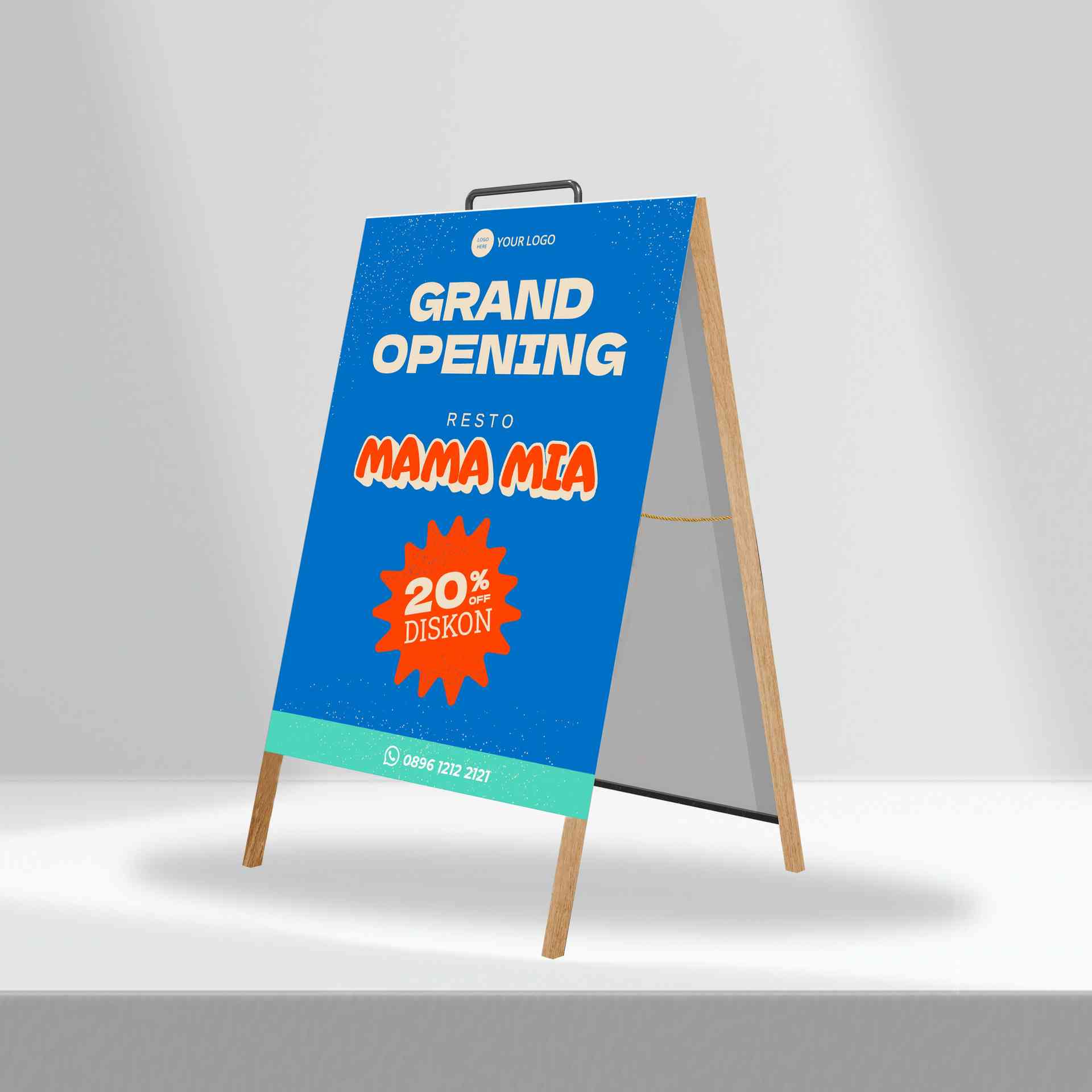 Triangle Stand Banner berbahan kayu ini memiliki bentuk segitiga berdiri dengan visual utama berupa latar biru terang, teks “GRAND OPENING RESTO MAMA...