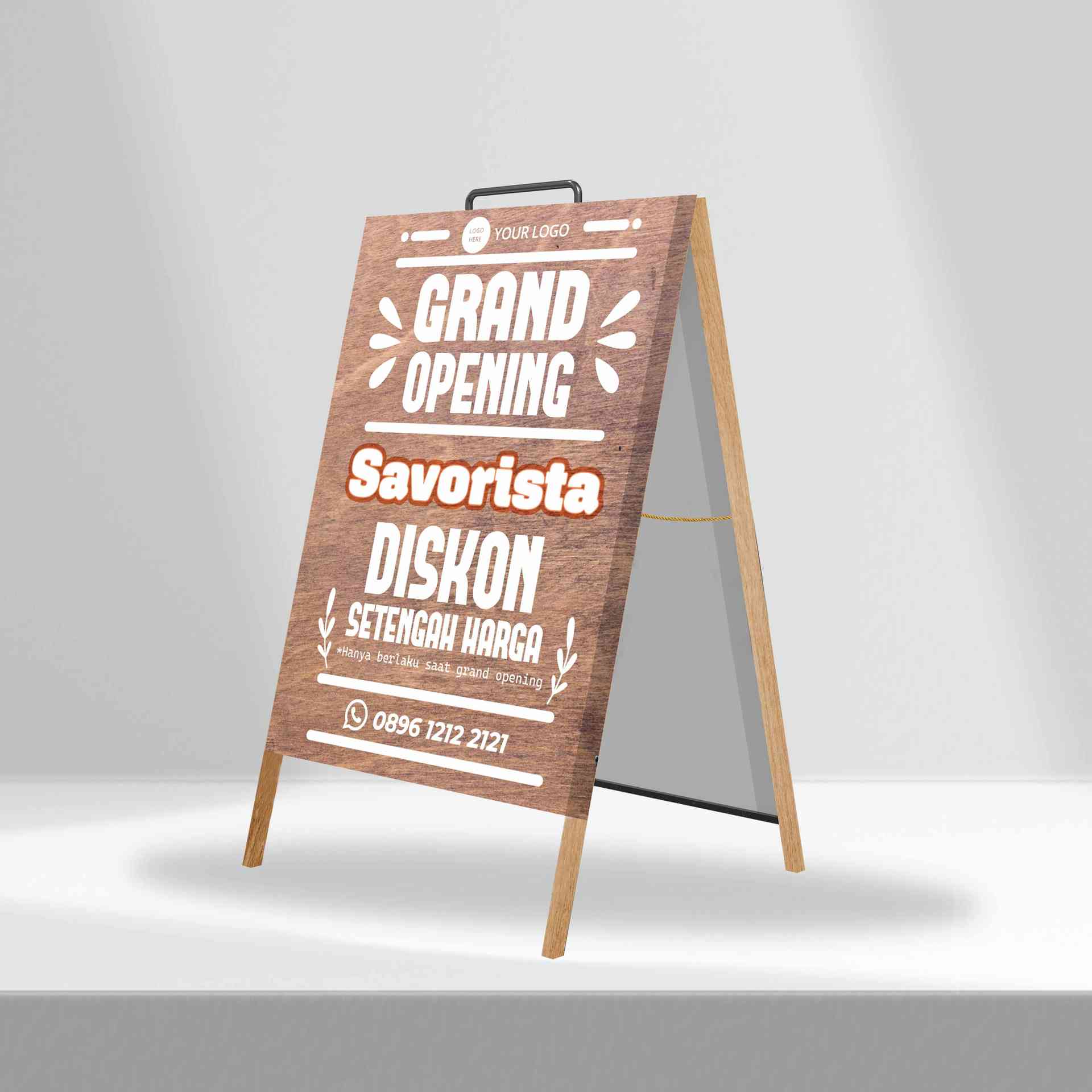 Triangle Stand Banner Kayu Opening Savorista berupa papan banner berbentuk segitiga yang berdiri dengan rangka kayu, menampilkan desain utama bertema...