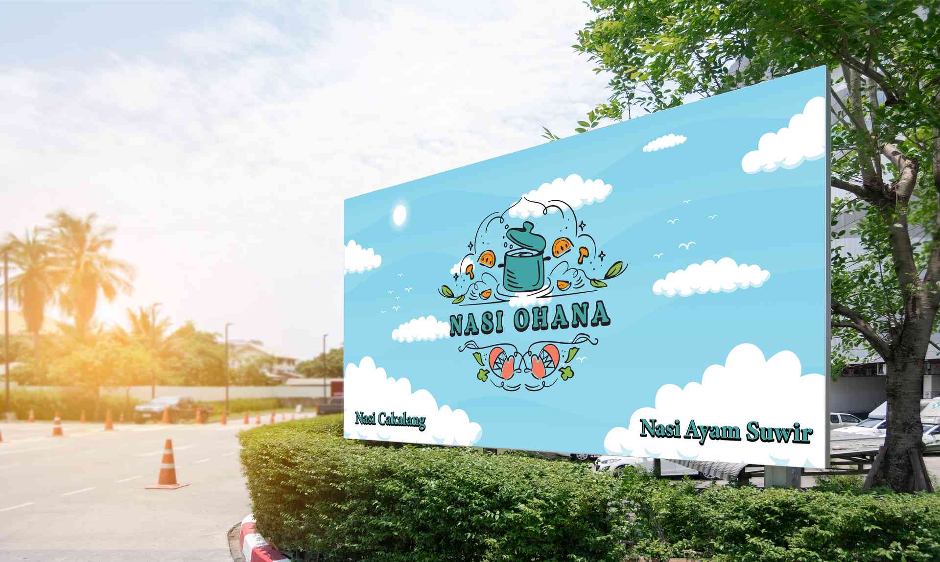Desain baliho ini memiliki tampilan yang cerah dan segar dengan latar belakang biru langit dan ilustrasi awan putih, menciptakan nuansa alami dan ring...