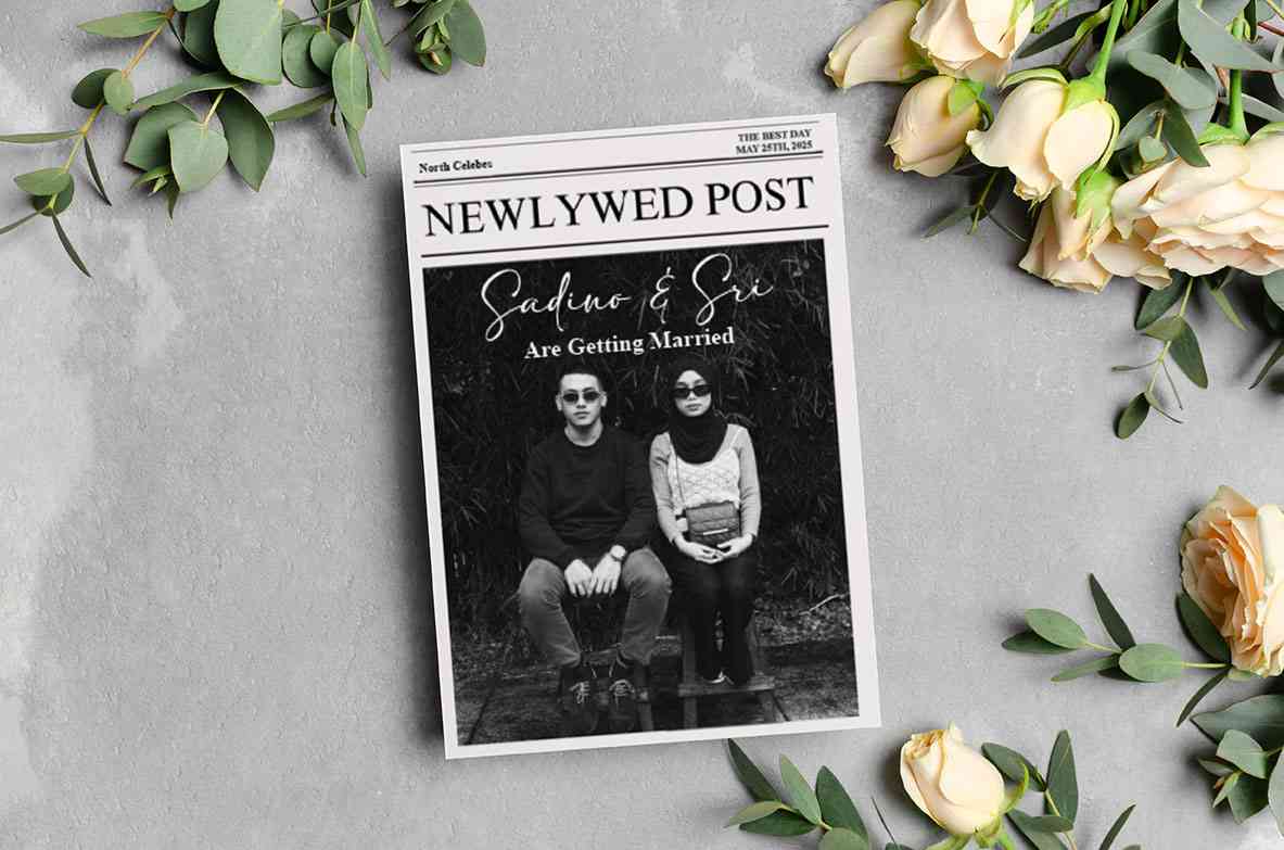 Undangan pernikahan bergaya koran klasik ini menampilkan pasangan Sadino & Sri dengan sentuhan hitam putih yang elegan dan minimalis. Layout khas...