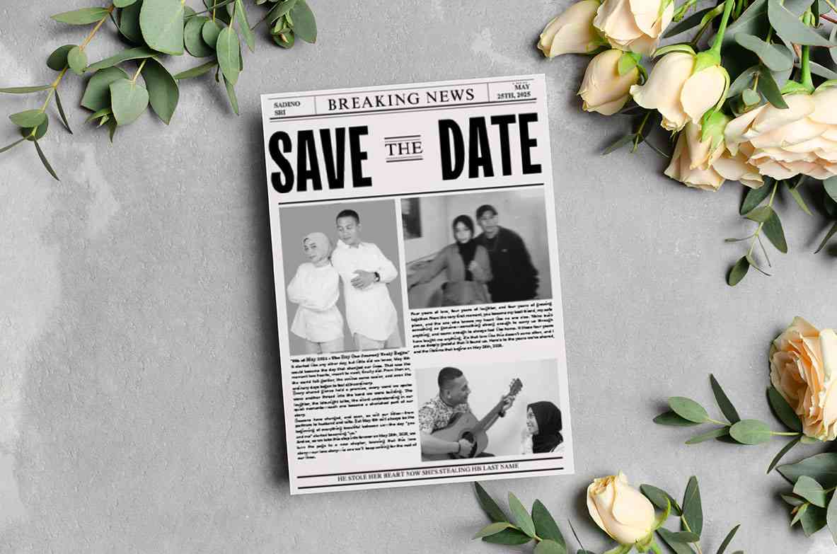 Desain terakhir ini tampil atraktif dengan tajuk "Breaking News", menyampaikan bahwa kabar pernikahan adalah berita besar! Dengan layout majalah dan k...