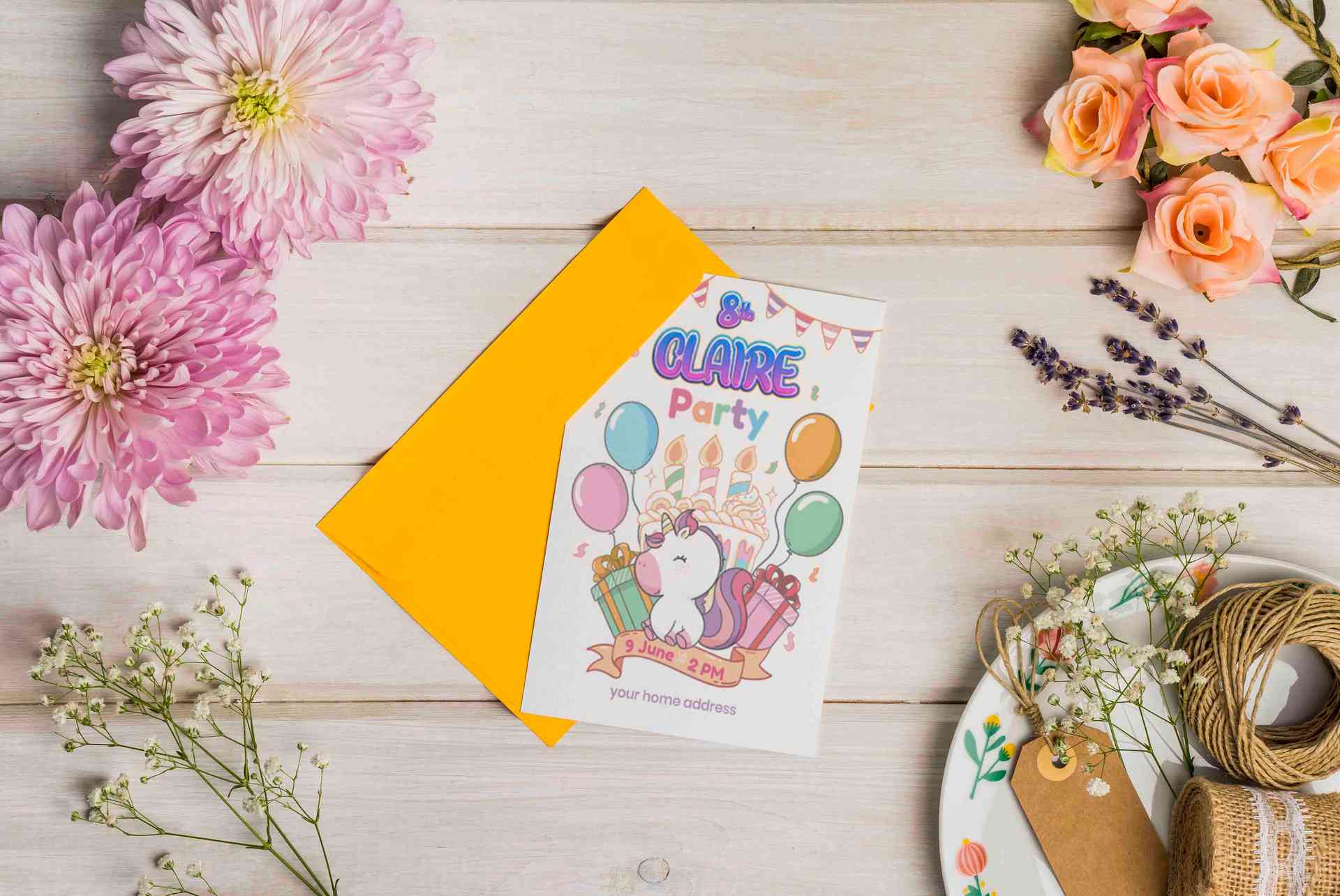Undangan ulang tahun dengan tema unicorn balon ini menampilkan bentuk persegi panjang dengan warna dominan pastel seperti biru, ungu, pink, dan kuning...