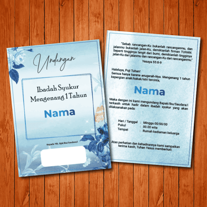 Undangan ibadah syukur mengenang 1 tahun ini dirancang dengan nuansa biru yang lembut dan elegan, dipadukan dengan motif bunga sebagai simbol penghorm...