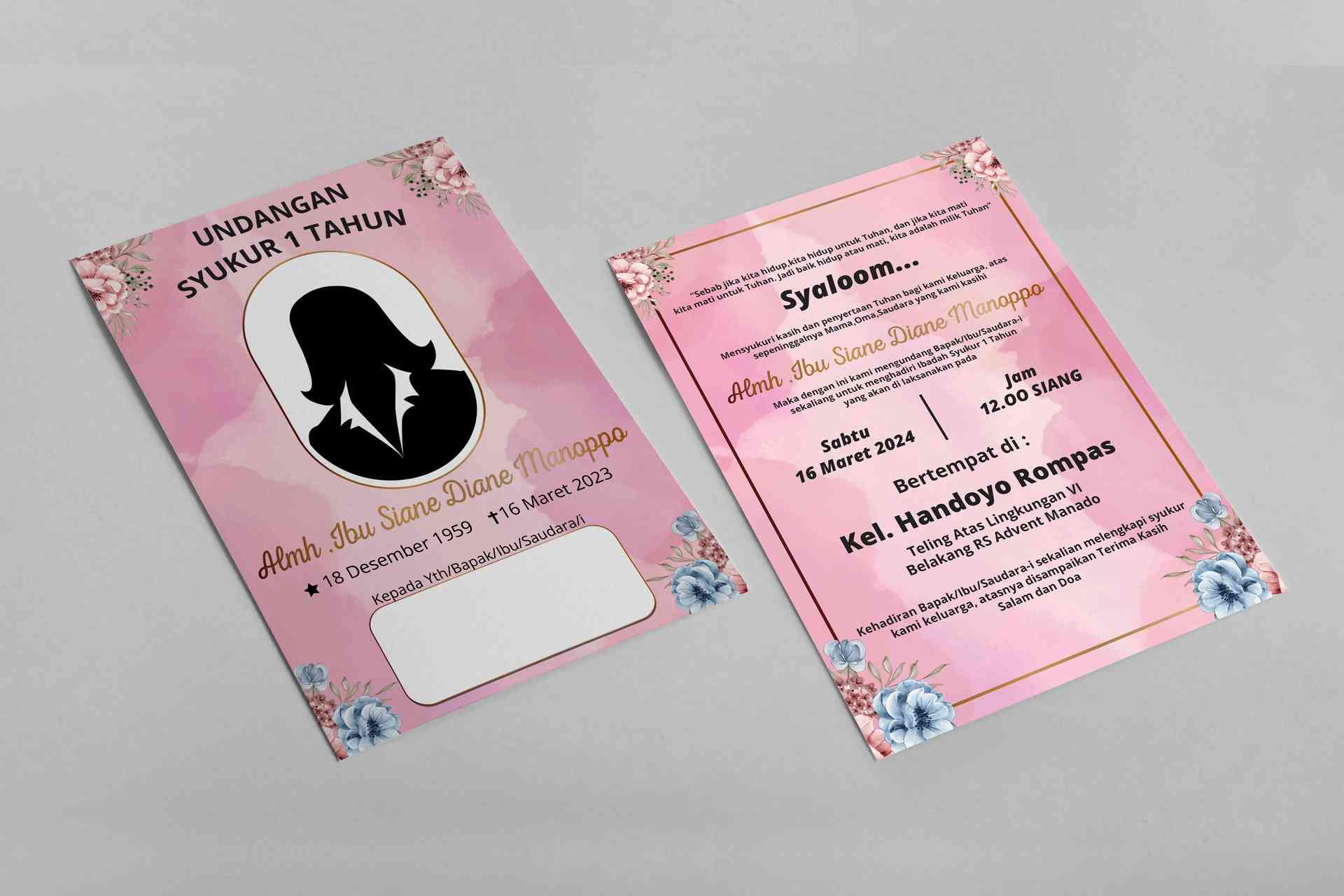 Undangan ibadah syukur mengenang 1 tahun ini dirancang dengan nuansa biru yang lembut dan elegan, dipadukan dengan motif bunga sebagai simbol penghormatan dan kasih. Format undangan dua sisi ini memuat kutipan ayat Alkitab, informasi pelaksanaan ibadah, serta kalimat undangan untuk keluarga dan kerabat yang dituju. Desain ini cocok untuk momen penuh penghargaan dalam mengenang kepergian orang terkasih secara rohani dan penuh kedamaian.