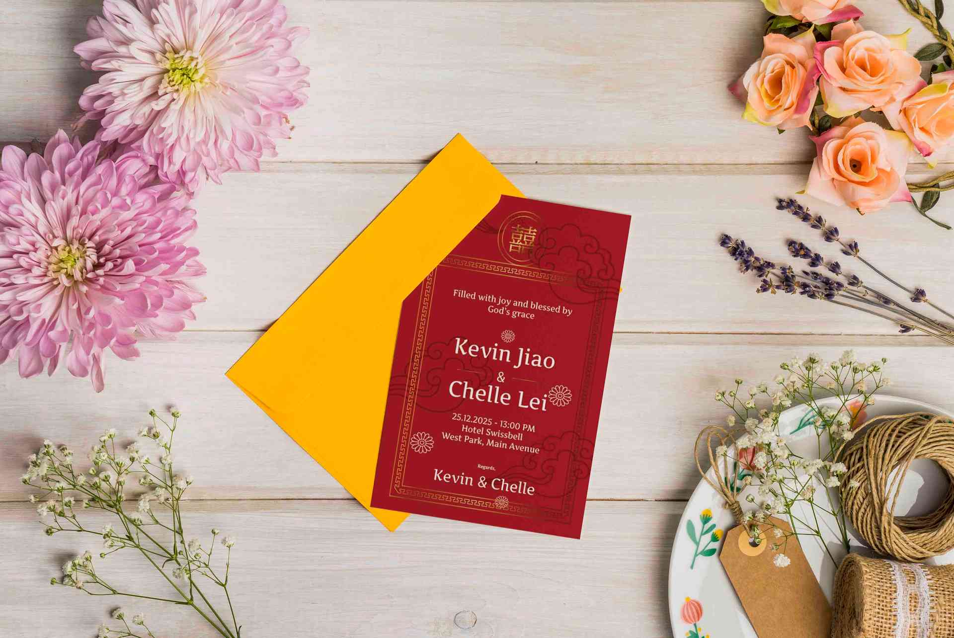 Undangan Pernikahan Elegan Merah Oriental berbentuk persegi panjang dengan dominasi warna merah marun dan aksen emas. Tampilan visualnya menonjolkan o...