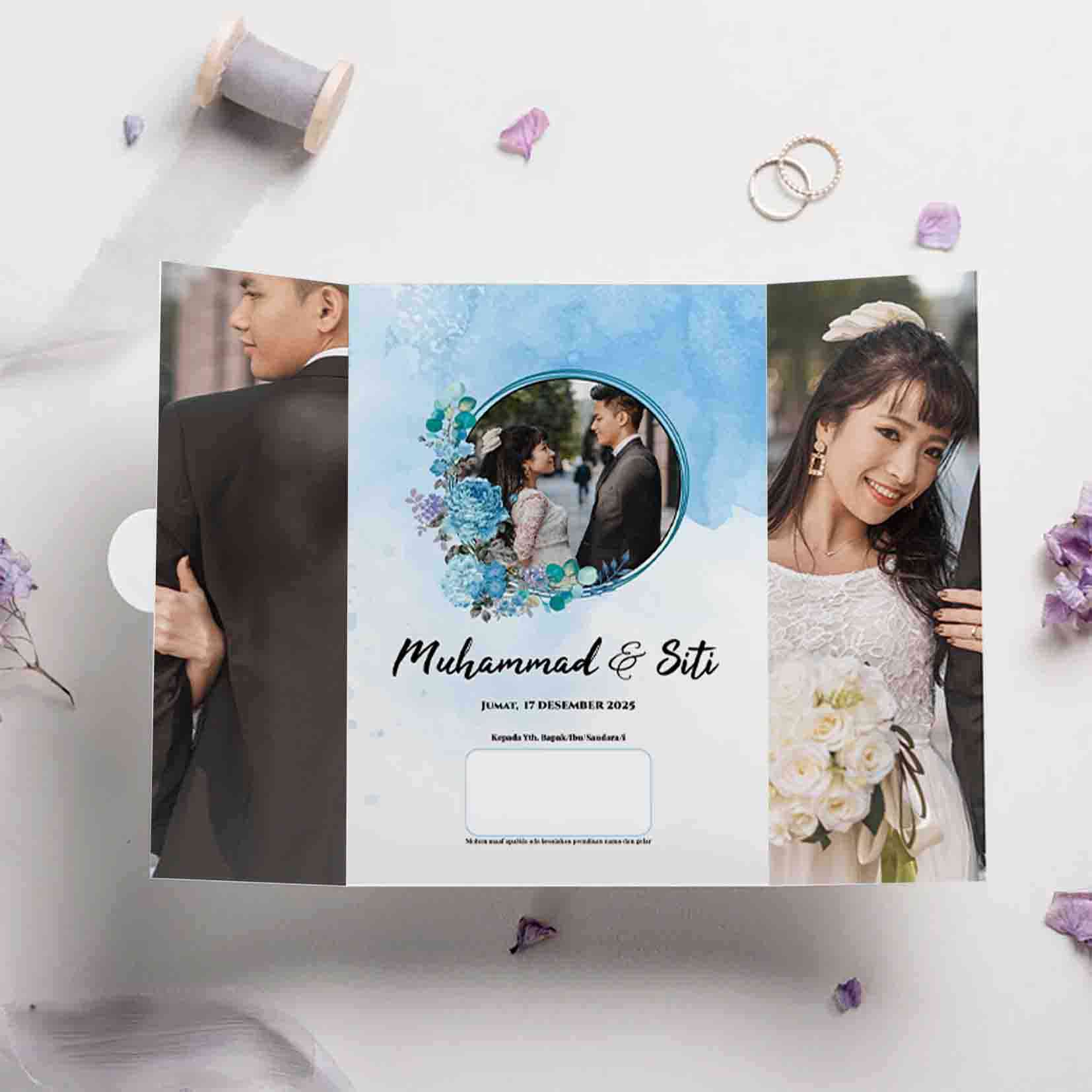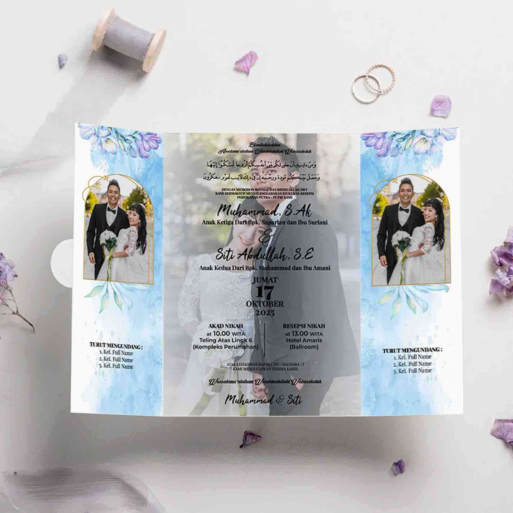 Undangan pernikahan lipat tiga bernuansa biru ini menampilkan desain elegan dan modern dengan sentuhan personal berupa foto pasangan pengantin. Bentuk...