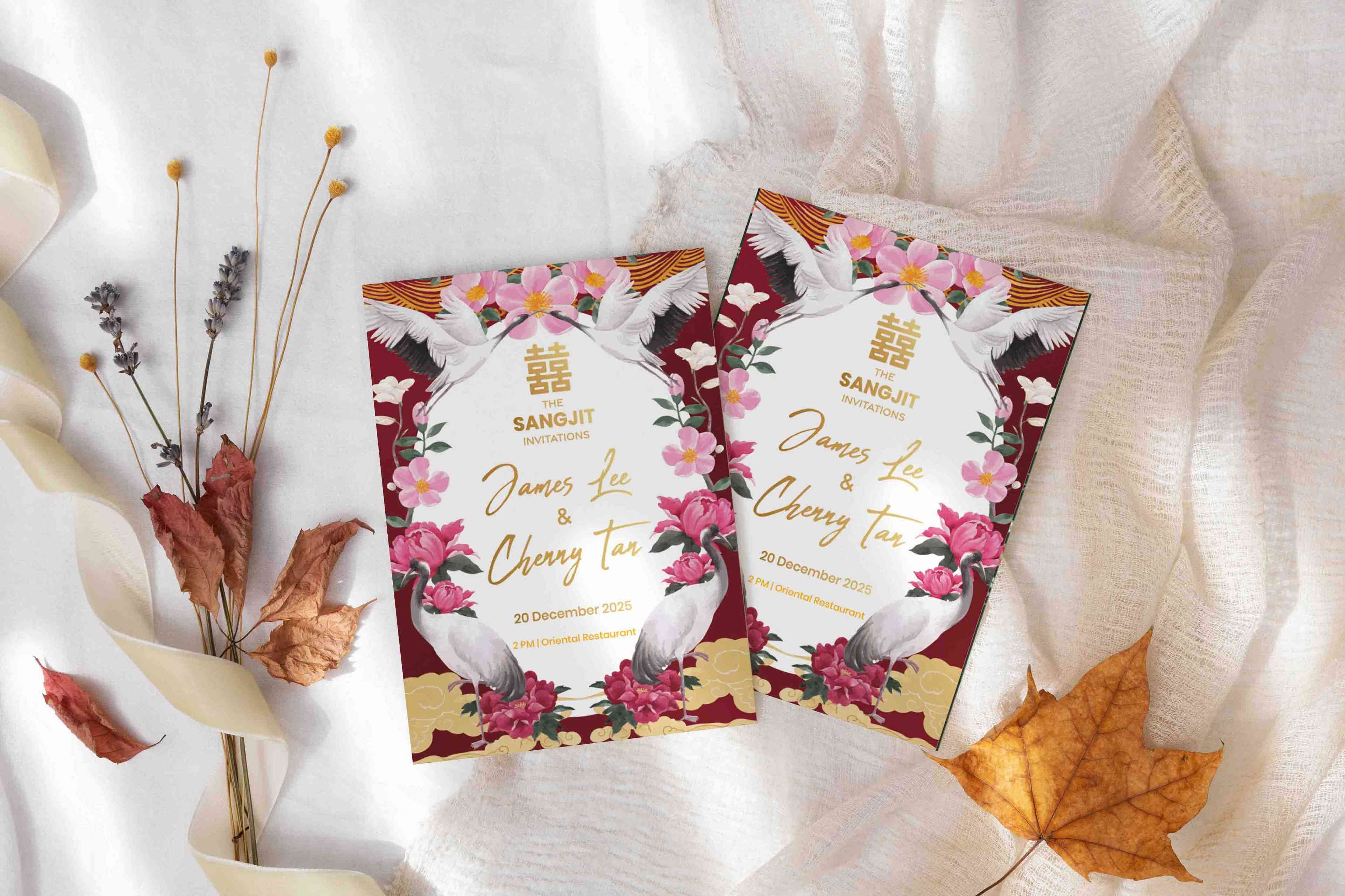 Desain undangan ini sangat elegan dan sesuai dengan adat Tionghoa, menggabungkan unsur tradisional dan modern. Kombinasi warna merah dan emas, simbol Shuang Xi, serta dekorasi floral khas Tiongkok menjadikannya undangan mewah, bermakna, dan penuh keberuntungan.