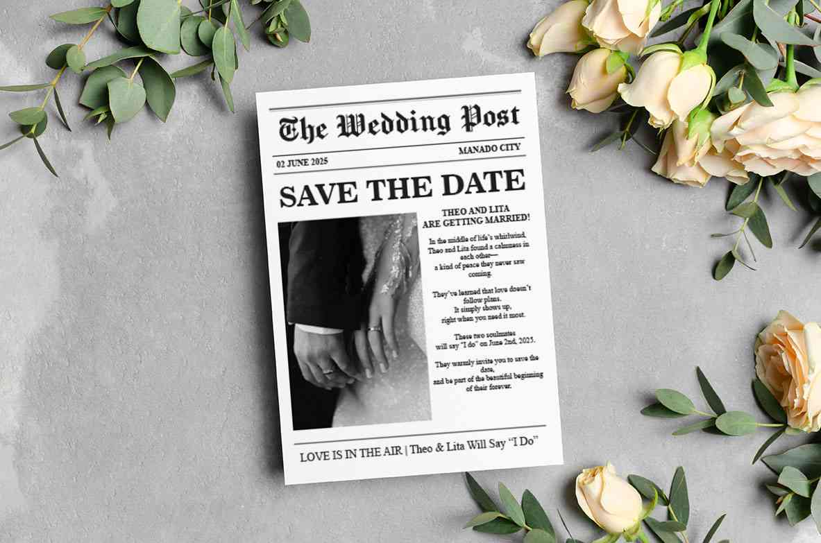 Undangan gaya berita ini memberikan kesan dramatis dan tegas, dengan fokus pada detail penting: tanggal pernikahan dan kisah singkat cinta pasangan. T...