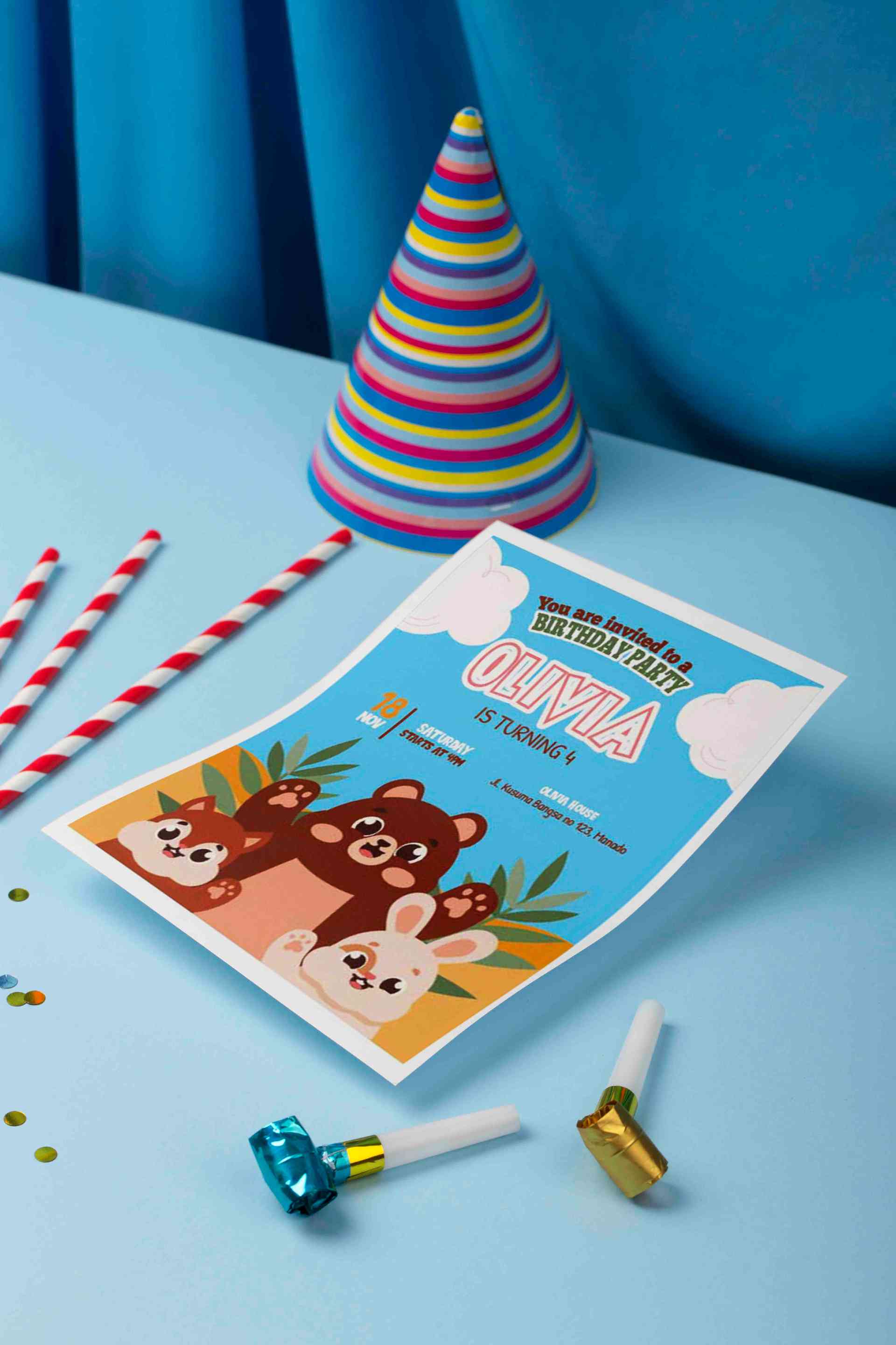 Undangan ulang tahun ini mengusung tema hewan hutan yang menggemaskan dengan ilustrasi beruang, kelinci, dan rubah berwajah ceria di bagian bawah. Lat...