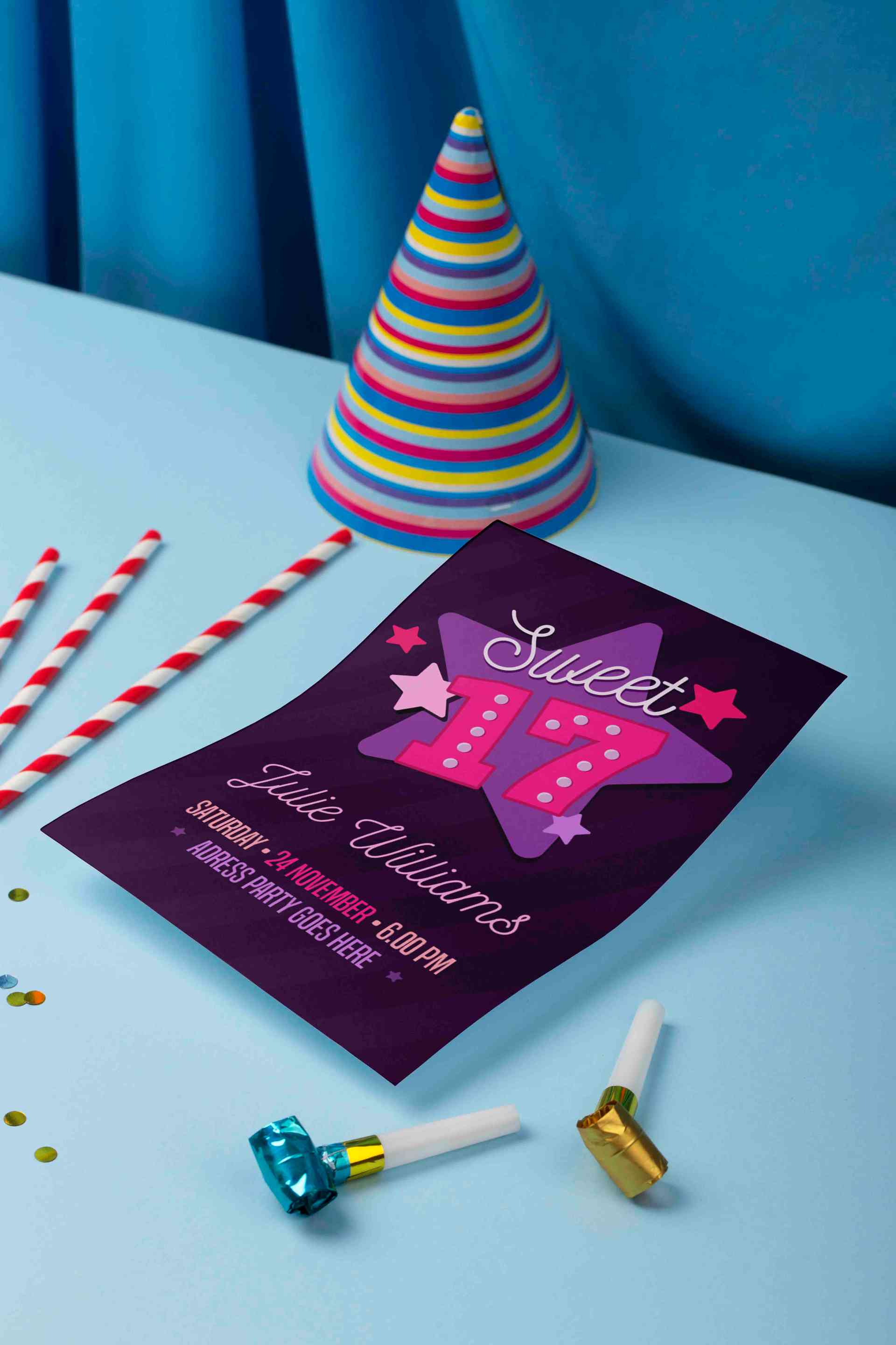 Undangan ulang tahun ini hadir dengan tema Sweet 17 yang youthful dan girly, menampilkan background ungu gelap elegan dengan ilustrasi bintang besar b...