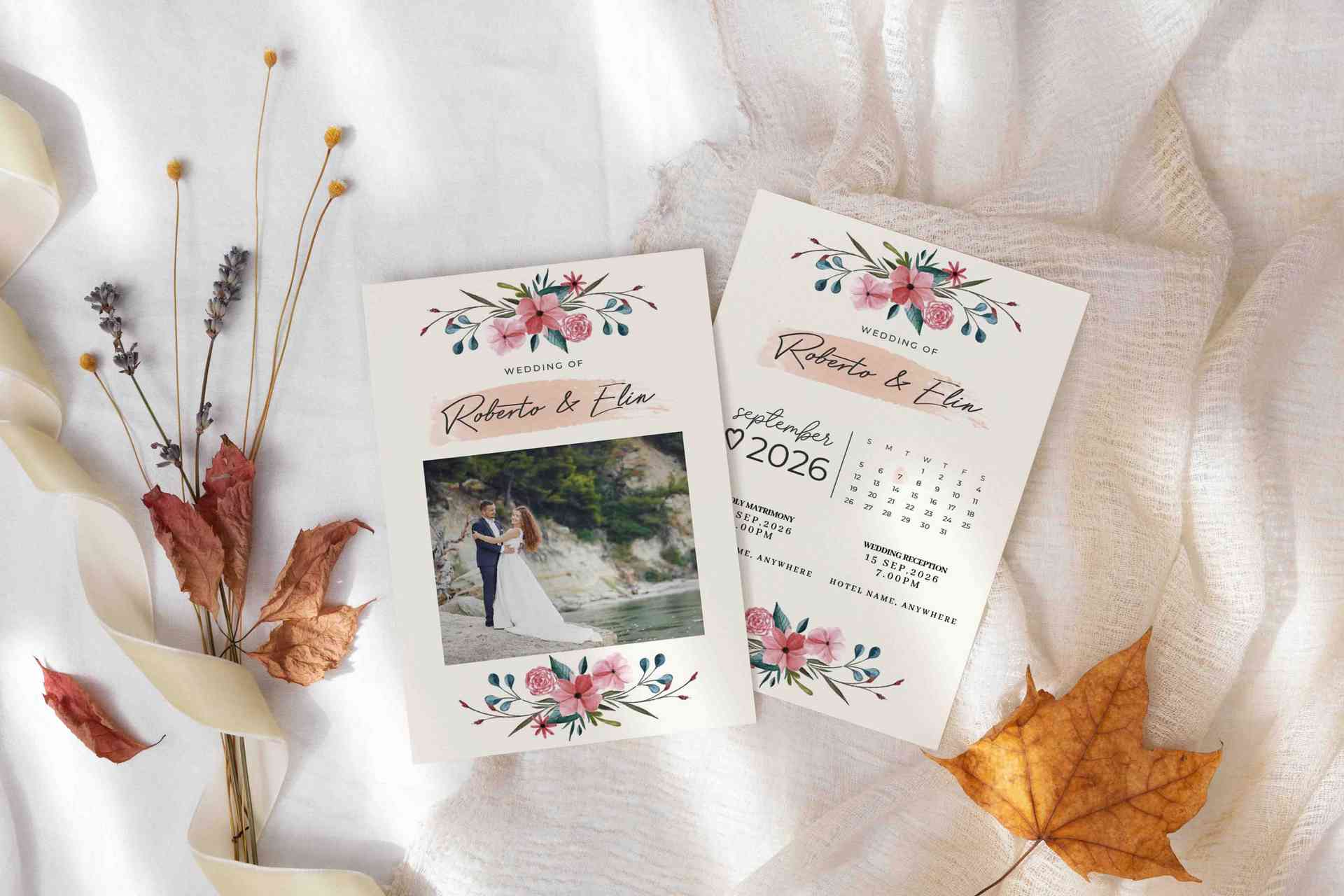Desain undangan pernikahan ini mengusung gaya floral yang elegan dan romantis dengan sentuhan warna pastel yang lembut. Terdiri dari dua sisi—satu men...