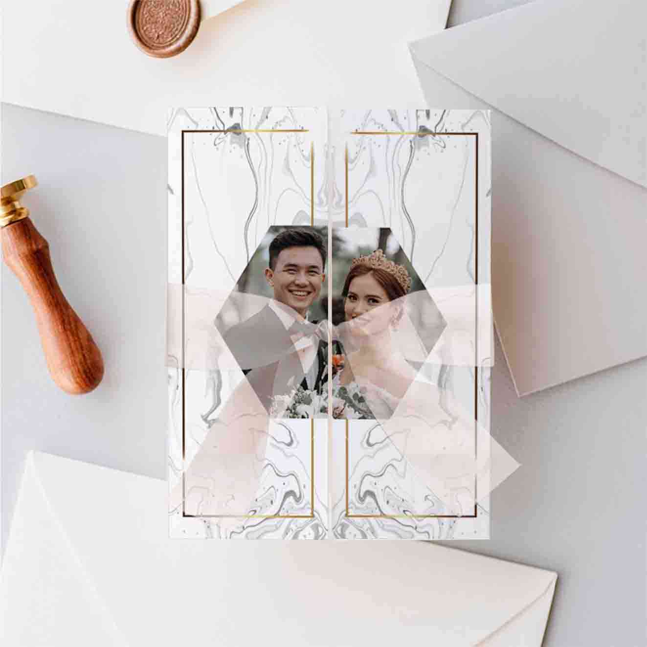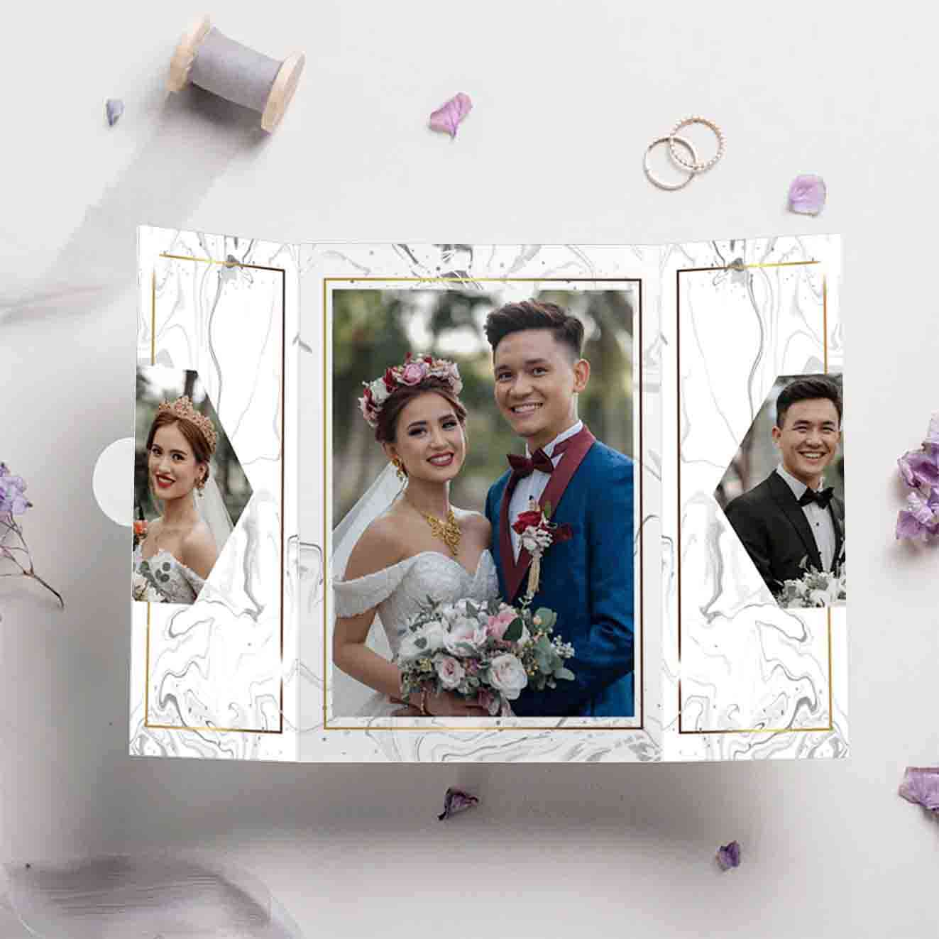 Undangan pernikahan lipat tiga ini tampil dengan desain marble putih elegan yang dipadukan dengan aksen garis emas (gold line), menciptakan kesan mewa...