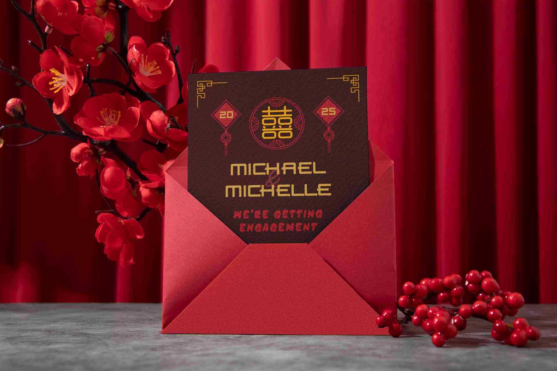 Rayakan momen pertunangan penuh cinta dengan undangan bertema Oriental modern ini! Desainnya mengusung warna merah dan emas yang melambangkan keberunt...