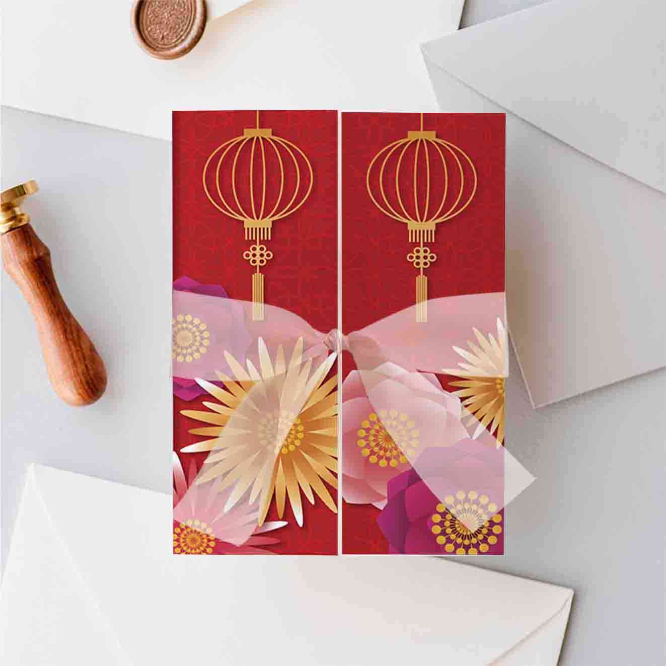 Undangan tunangan ini menghadirkan nuansa Oriental mewah dengan warna merah dan emas yang megah, melambangkan cinta abadi, kemakmuran, dan kebahagiaan. Motif bunga teratai berpadu indah dengan simbol Double Happiness, menciptakan kesan harmonis dan penuh makna budaya Tionghoa. Setiap detailnya dirancang untuk memancarkan keanggunan, keberuntungan, dan kehangatan cinta pasangan yang akan melangkah menuju ikatan suci. Cocok untuk acara engagement atau pernikahan bertema oriental elegan.
