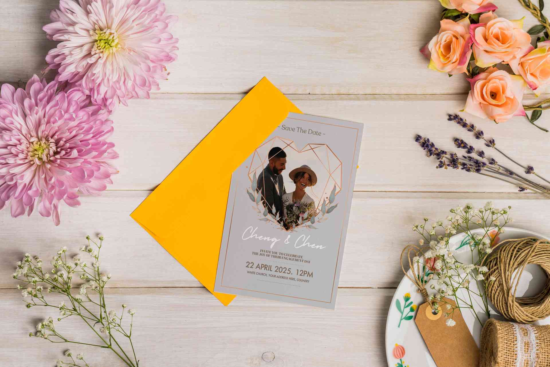 Desain undangan ini menampilkan nuansa romantis dan elegan dalam format portrait yang dikemas dalam latar flat lay dengan bunga dan ornamen vintage di...