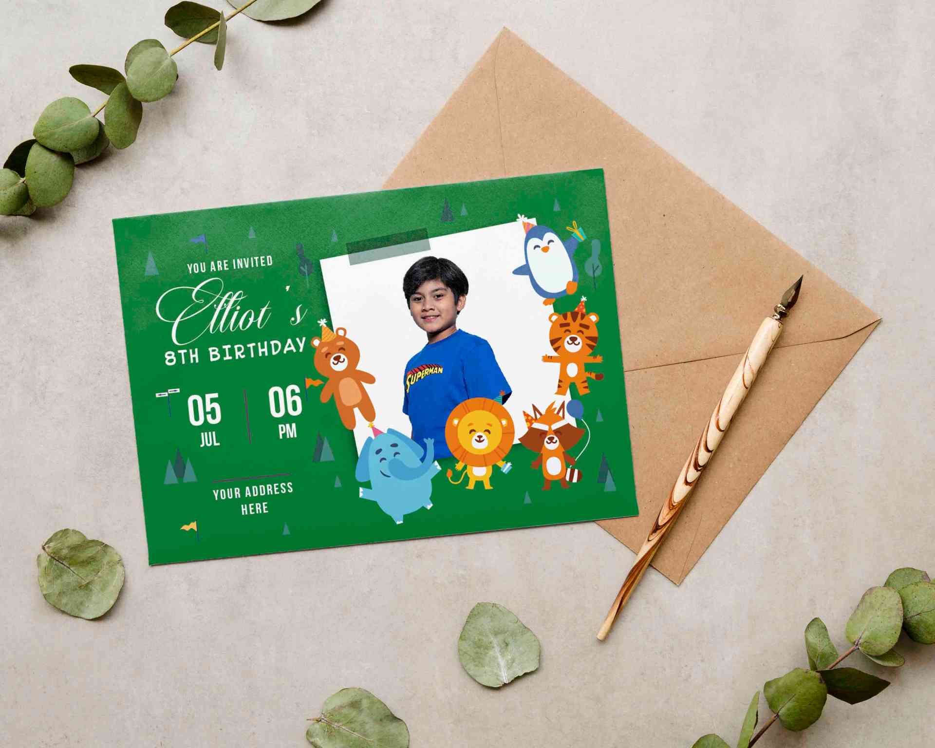 Undangan ulang tahun anak bertema Wild Animal ini berbentuk persegi panjang dengan dominasi warna hijau cerah sebagai latar utama, menonjolkan elemen...