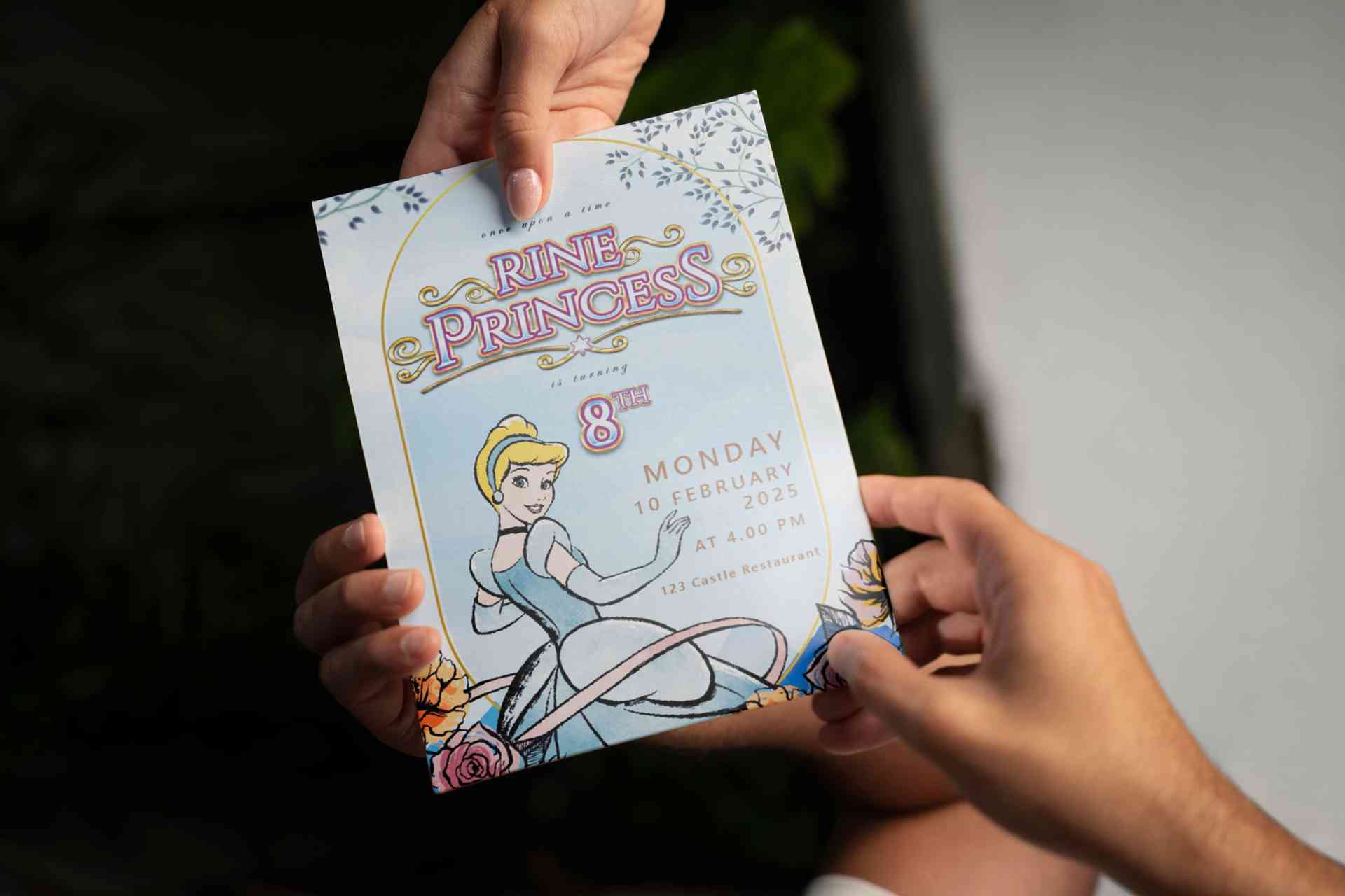 Desain undangan ini sangat cocok untuk ulang tahun anak perempuan bertema princess, royal ball. Kombinasi warna emas, ilustrasi klasik, dan dekorasi bunga mawar menjadikannya undangan yang mewah, elegan, dan penuh keajaiban dongeng.