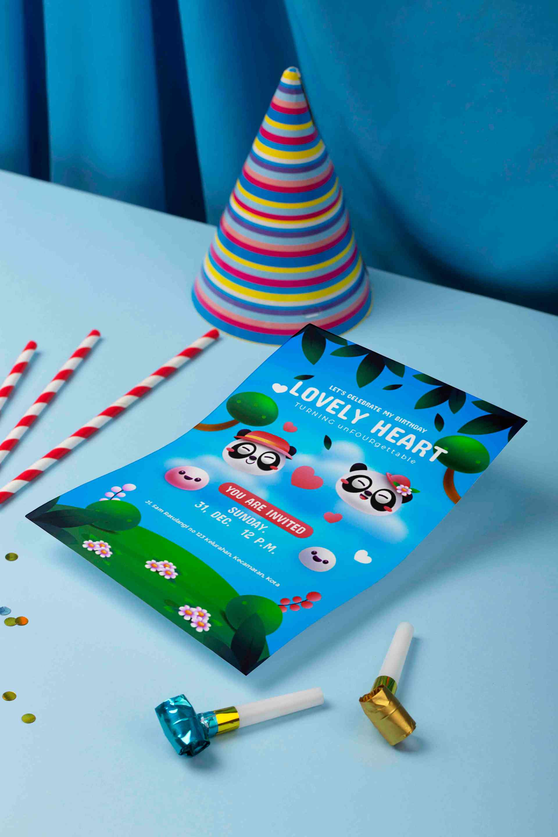 Undangan ulang tahun ini menampilkan tema panda yang lucu dan penuh warna ceria, dengan latar belakang biru muda yang menenangkan dihiasi dedaunan hij...