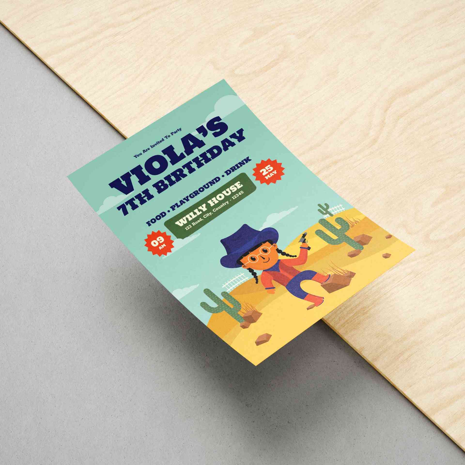 Undangan ulang tahun anak dengan tema koboi ini berbentuk persegi panjang dan menampilkan ilustrasi karakter anak mengenakan topi koboi berwarna biru...