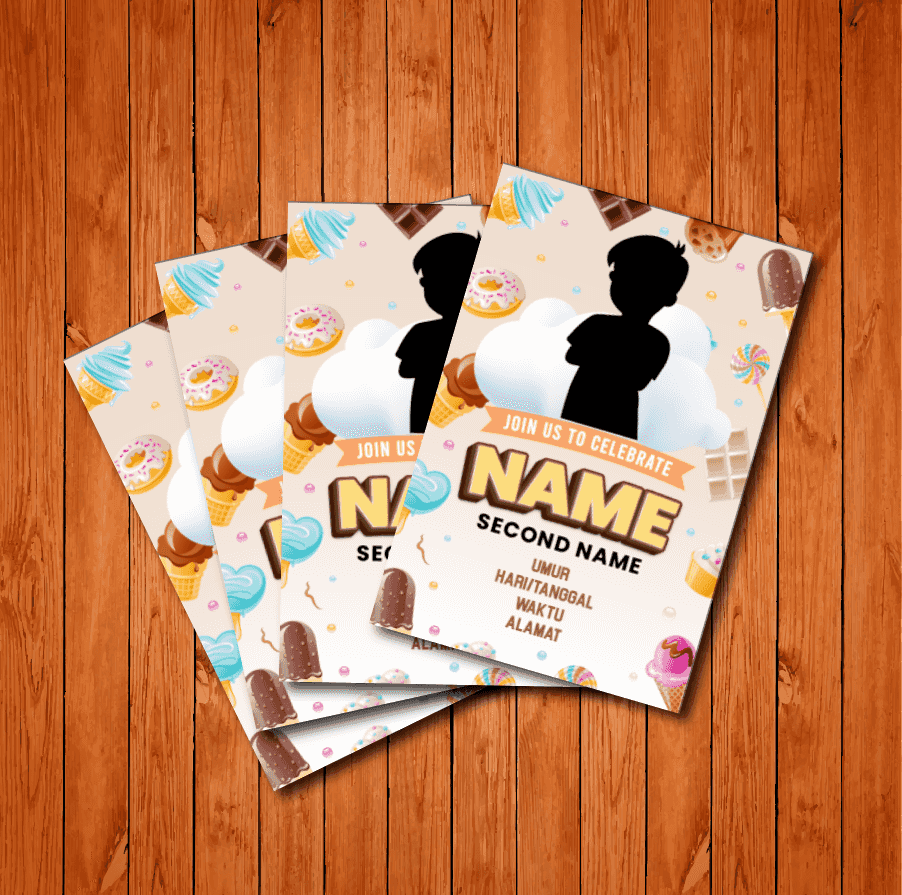 Undangan ulang tahun ini memiliki desain yang ceria dan manis, dihiasi dengan berbagai ilustrasi es krim, coklat, permen, donat, dan marshmallow, menc...