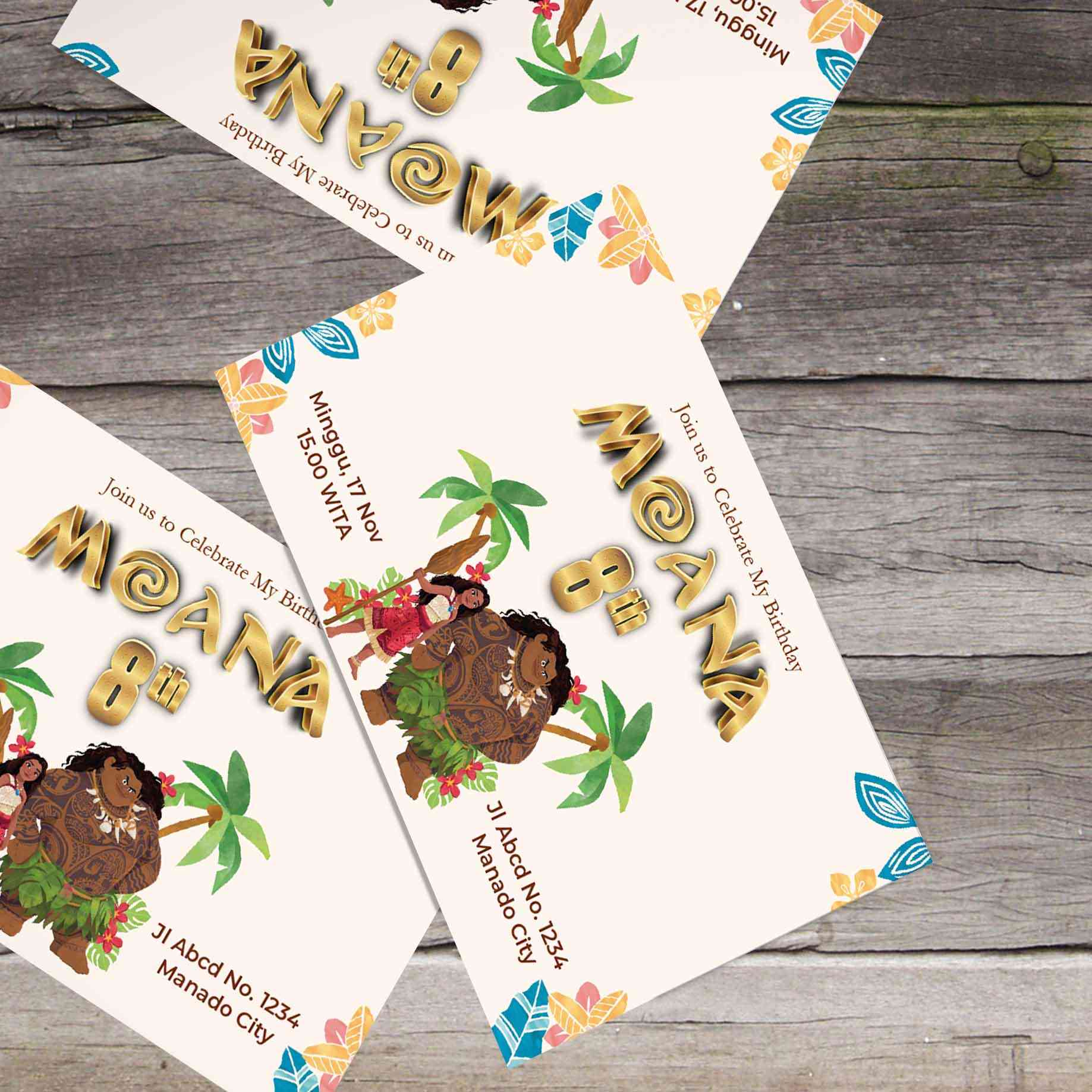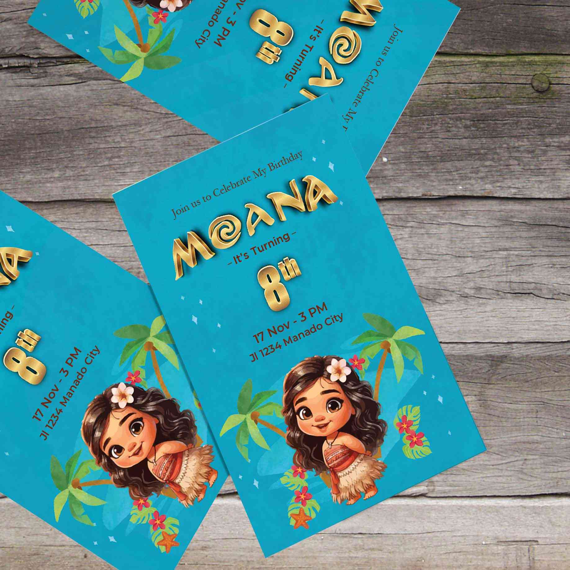 Undangan ulang tahun ini akan membawa tamu langsung ke dunia Moana dengan nuansa tropis yang cerah dan penuh warna. Di bagian depan undangan, terdapat...