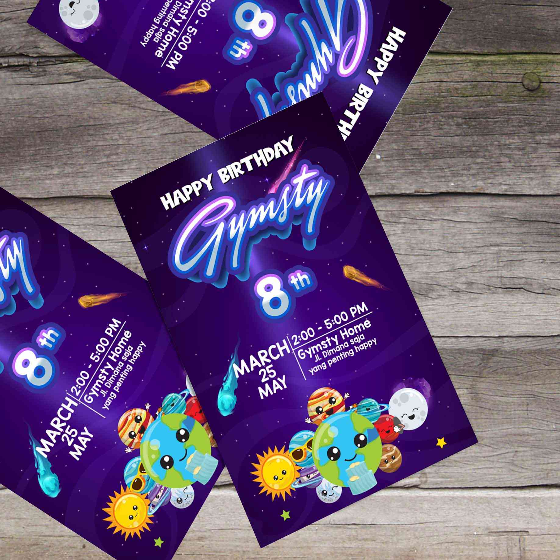 Gambar ini menampilkan desain undangan ulang tahun bertema luar angkasa dengan nuansa futuristik dan warna dominan ungu tua. Latar belakangnya dipenuh...