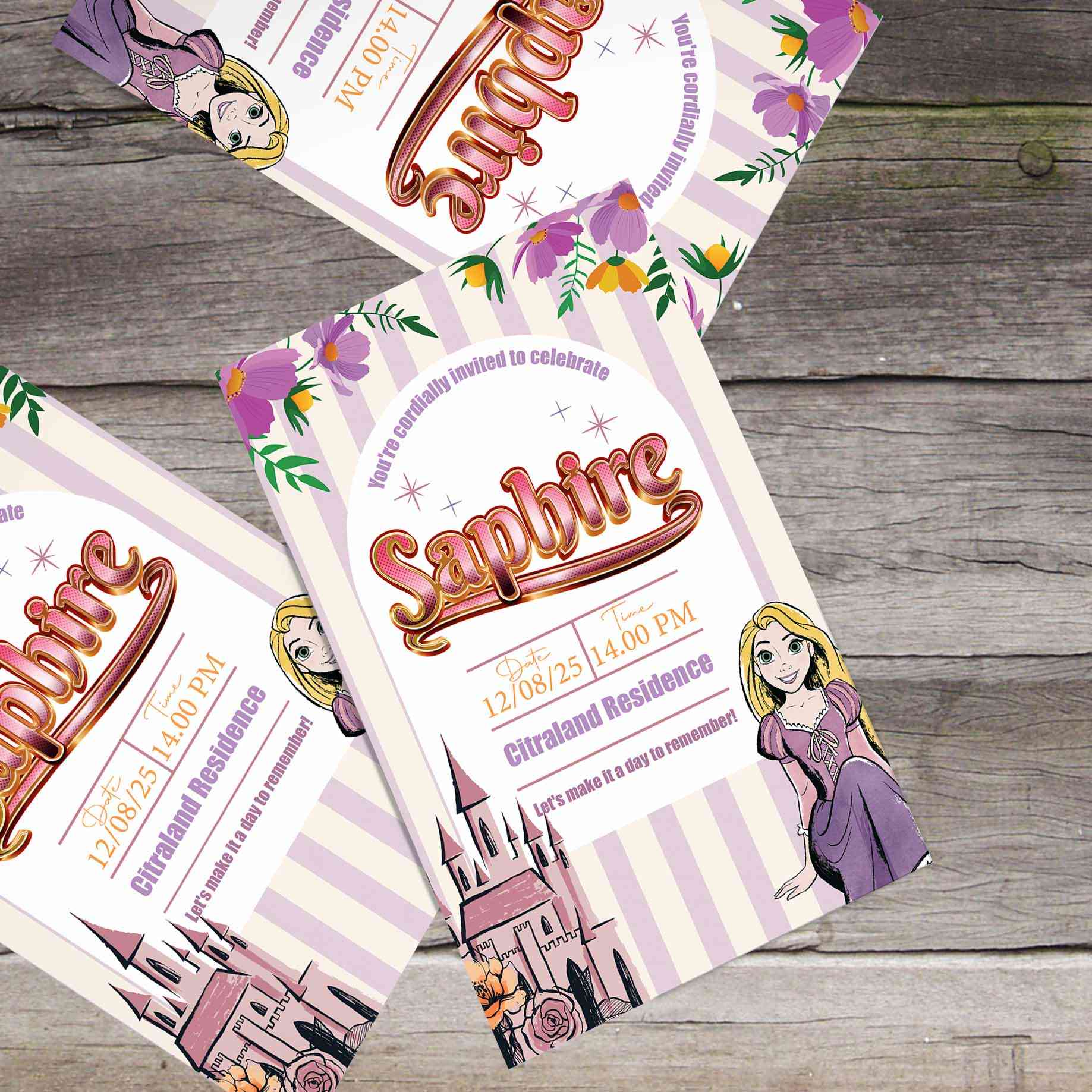 Undangan ulang tahun bertema Rapunzel ini hadir dengan desain yang anggun dan penuh pesona. Di latar belakang, ada sebuah kastil megah yang terletak d...